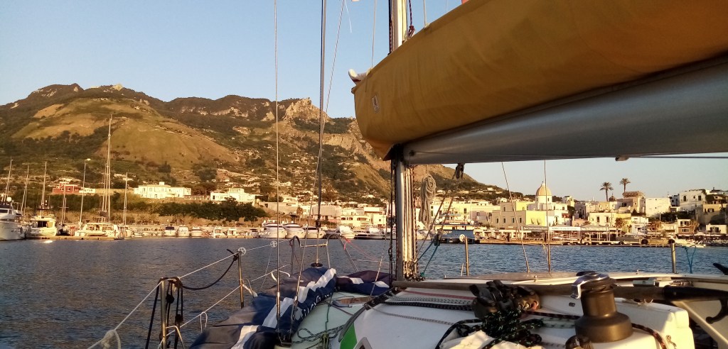 Nous arrivons enfin au très joli porto Forio sur l’île d’Ischia en fin de journée. L’endroit est délicieux et sent bon les vacances familiales au calme. L’accueil est de grande qualité avec l’ormeggiatore qui nous accueille avec gentillesse. L’île semble très belle avec une grande colline clairsemée de végétations et de discrètes villas entourées d’arbres et cultures en tout genre. Nous sommes heureux d’arriver dans un endroit aussi paisible après la nuit et la journée difficile que nous avons vécu.