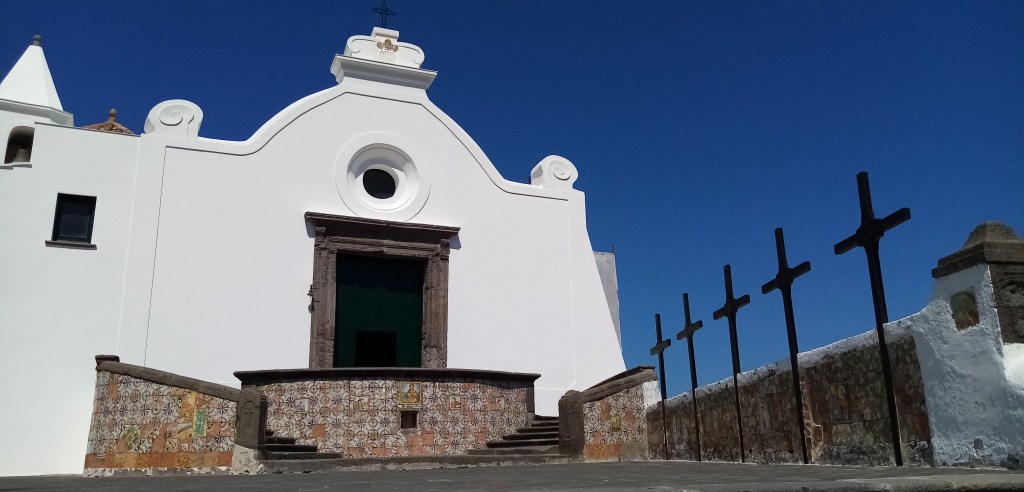 Nous arrivons enfin à un des joyaux de l’île, Sant’ Angelo. Le parking est ici payant et l’endroit pietonné, chose assez rare en Italie. C’est un petit hameau de maisons blanches blotties les unes contre les autres face à un petit isthme surmonté d’un gros rocher. De petites barques sont amarrées, lascives en attente d’une journée en mer. J’en profite pour acheter quelques produits de l’île et notamment du miel de citronnier.