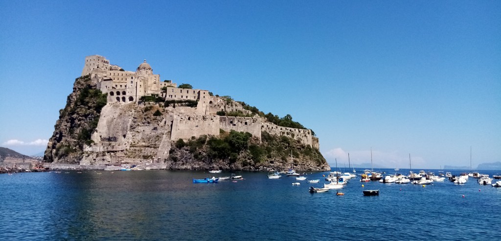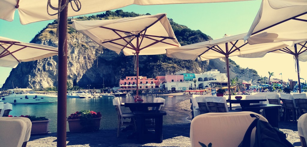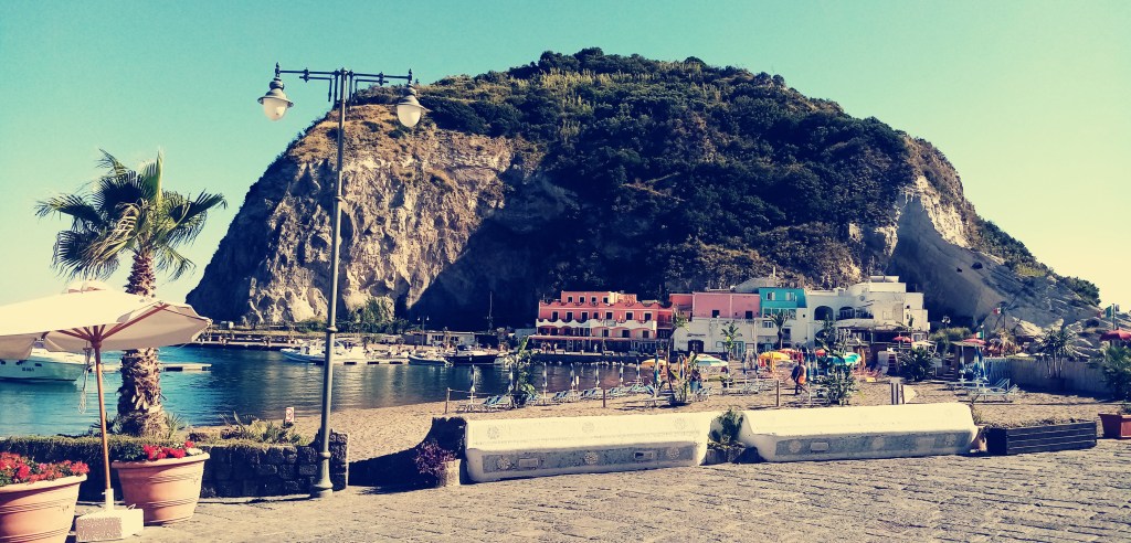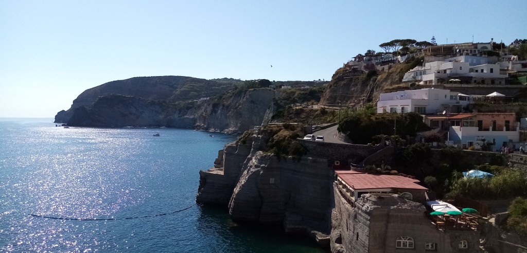 Nous décidons de rester 2 nuits ici, le temps nécessaire pour bien se reposer, préparer le bateau pour la suite et surtout profiter de l’île. Pour ce faire nous louons un scooter 30€ la journée. Je n’ai fait du scoot qu’une seule fois dans ma vie c’était à Formentera, mais il était beaucoup plus léger et simple que celui loué ici. Il est lourd et difficile à manier pour un novice. Qu’importe le flacon pourvu que l’on ait l’ivresse, nous voici partis sur les routes d’Ischia!