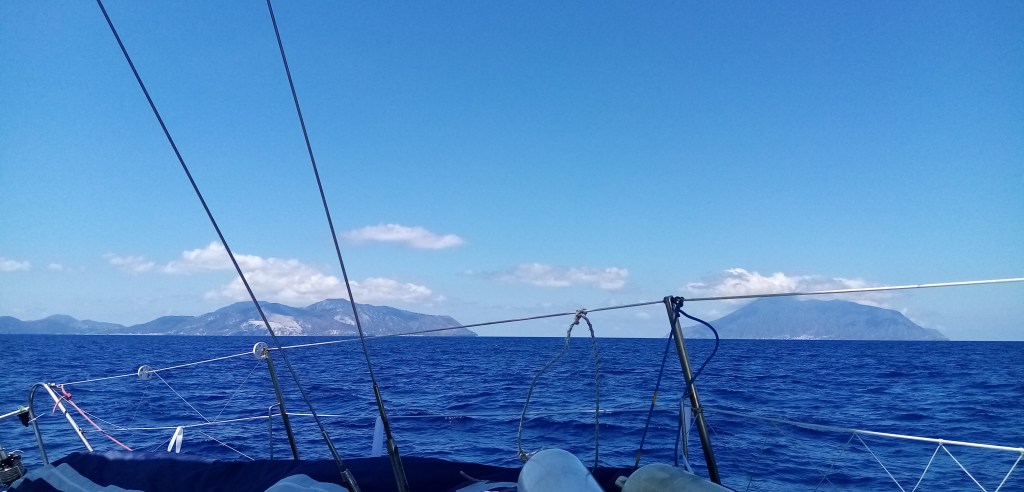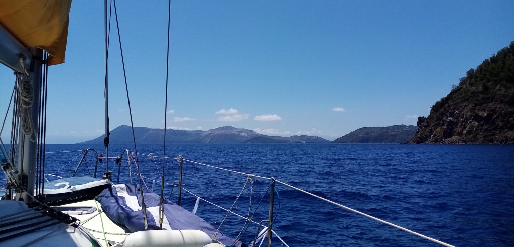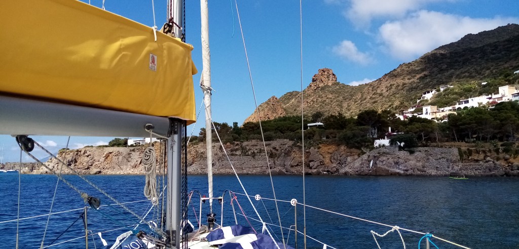 Nous partons de Panarea et de notre joli mouillage tranquille en direction d’une petite Marina située à côté de la ville de Lipari sur l’île éponyme. La navigation est belle avec un vent d’ouest à nord ouest toujours présent dans ce secteur. Quand on parle de vent dominant c’est sans aucun doute celui ci. L’île de Lipari se dessine maintenant nettement et nous pouvons apprécier sa verdure en contraste avec les deux précédentes.