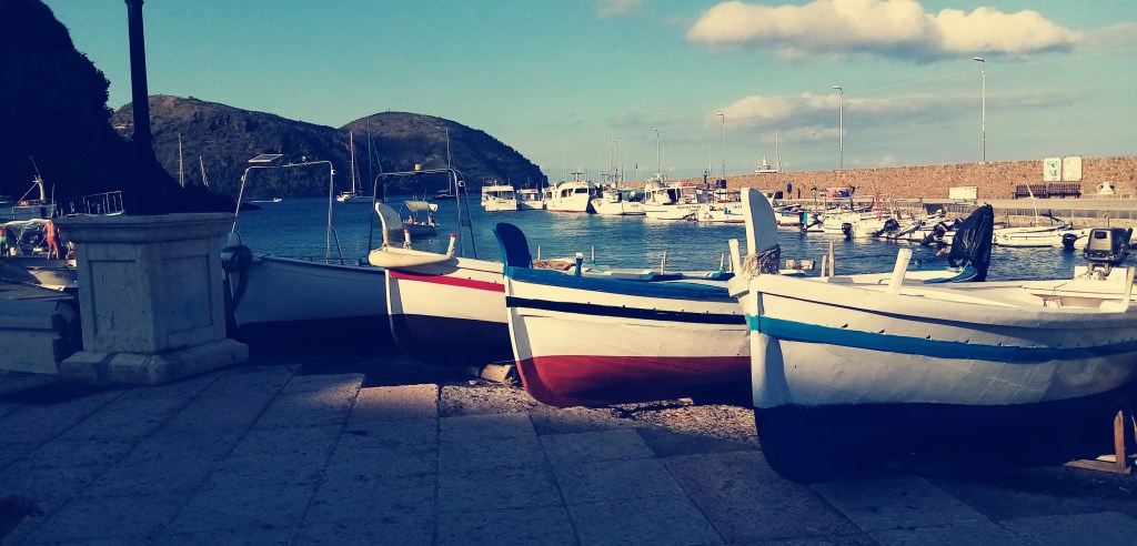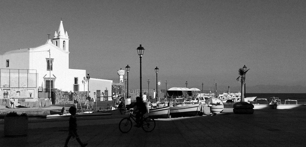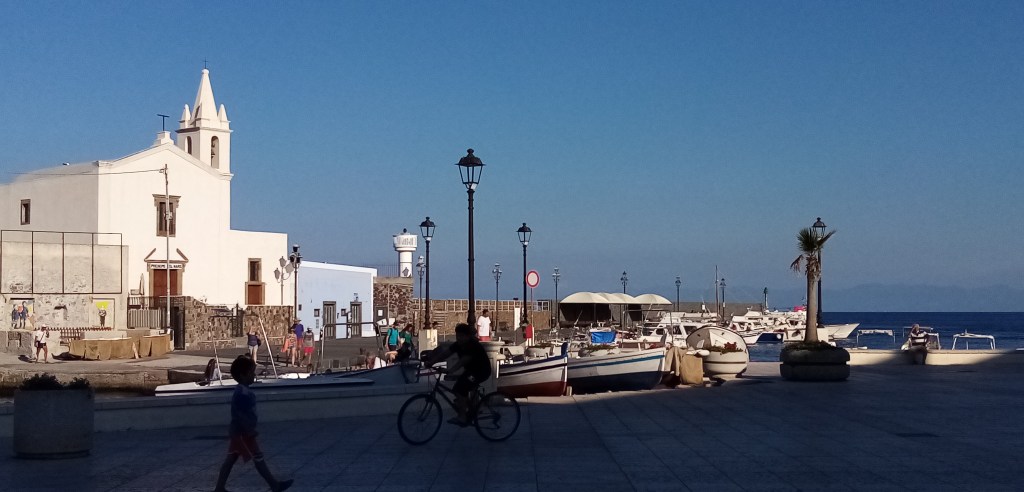La nuit a été très houleuse et nous sommes tous fatigués de ce mode de vie depuis plusieurs jours dans les Éoliennes. Toutes les nuits où presque ont été sujettes à la houle, quand ce n’est pas celle générée la journée par les nombreux ferrys qui désertent les îles, c’est celle de la nuit générée par les vents dominants d’ouest et nord ouest, et qui arrive à contourner les îles, peu abritées. J’offre à Doriane une nuit d’hôtel au joli village de Canetto situé juste au fond de la baie. Je trouve un mouillage agréable, seul juste devant la plage du village. Nous resterons ici 2 nuits (avec de la houle…). La première nuit, passée seul avec Solenzu, est étrange avec, en fond, une messe en plein air donnée par le cureton local dans son église kitschissime affublée, à l’entrée, d’un grand porche rose tout éclairé. On dirait un peu un prédicateur à l’américaine. Le lendemain, on se retrouve avec Doriane dans ce charmant et un peu désué village de bord de mer. Nous décidons de quitter les Éoliennes plus tôt que prévu. Les mouillages sont trop exposés à la houle et j’avoue aussi en avoir ma claque des bateaux à moteur…