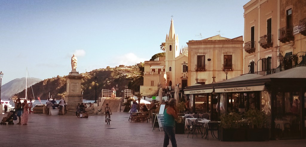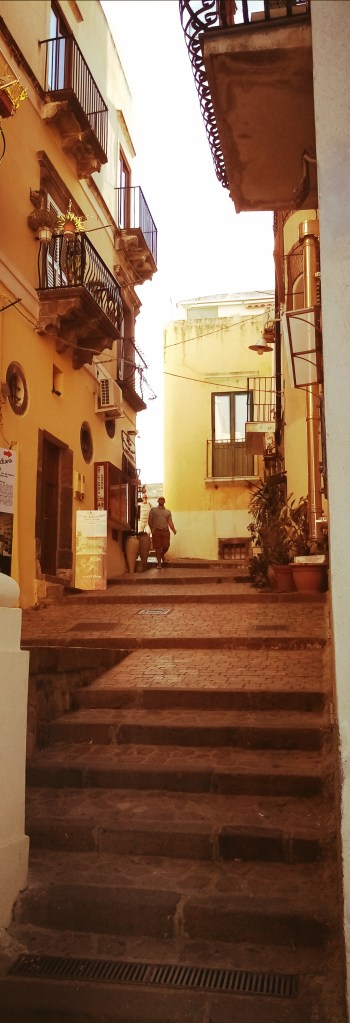 La petite ville de Lipari, commune de l’ensemble des îles Éoliennes, est assez étonnante et charmante par son architecture. Les bâtiments sont colorés mais sont dans un peu en état de décrépitude, ce qui n’enlève rien au charme. On ne ressent pas vraiment de pauvreté mais un train de vie très modeste de ses habitants. La rue principale est toute dévouée au dieu tourisme avec un grand nombre d’échoppes vantant une soi-disant authenticité pour attraper des nigauds de touristes. Nous sommes morts de soif, j’entre dans une de ces échoppes et ressors avec un litre d’aqua frezzante. Nous prenons des petites rues adjacentes à la via des touristes à la recherche d’un peu de vraie authenticité. Nous arrivons bientôt au port, charmant avec des gamins qui jouent à sauter dans la mer et des vieux pêcheurs, las, qui les regardent avec la gourmandise de la vieillesse qui regarde la fougue d’une jeunesse perdue.