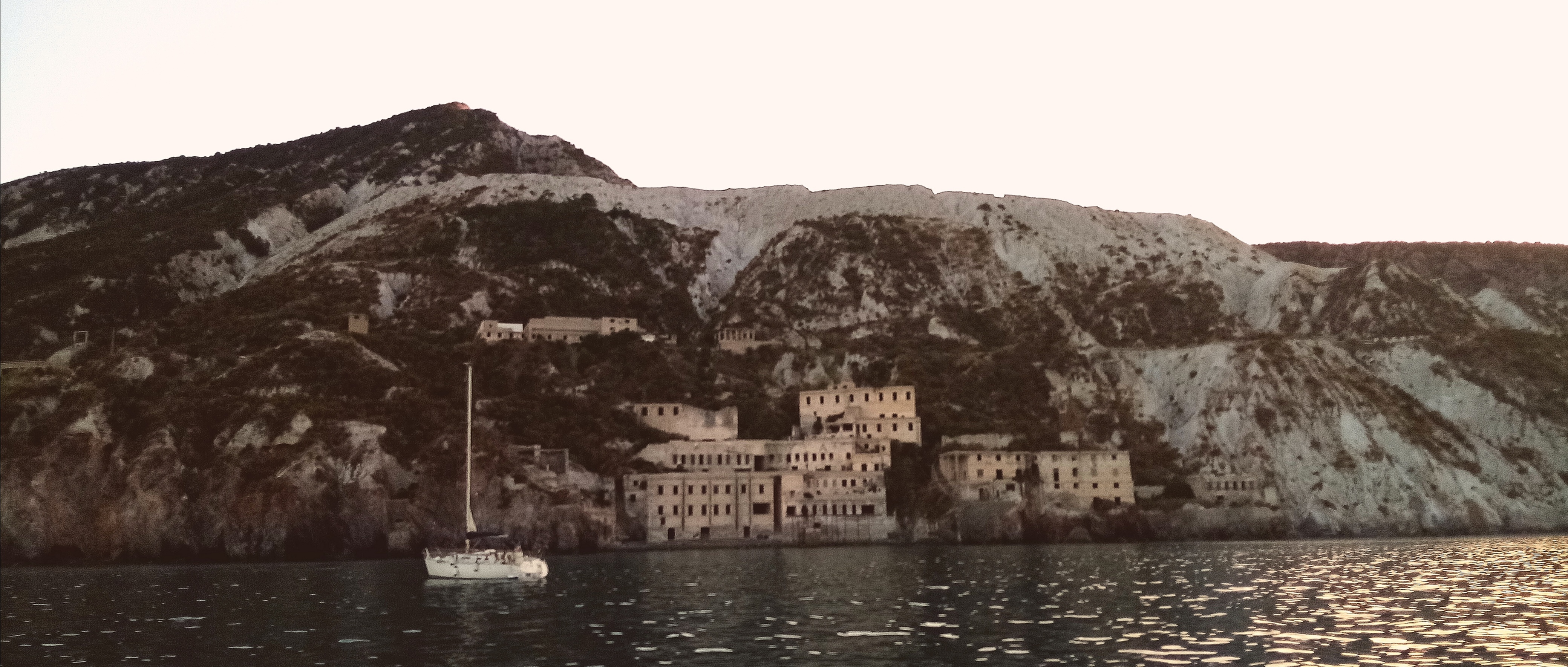 C’est à la voile, par un vent très faible que nous mettons le cap vers la fameuse baie de pierres ponces, Porticello. Distante d’à peine 3 milles, nous mettons 3h pour y arriver à une allure de chameaux. La baie est très atypique, avec une eau très turquoise et des fonds tout blanc. Le paysage est insolite, occupé par une ancienne carrière usine désaffectée de pierres ponces. C’est étrange d’être dans un joli environnement naturel avec ces infrastructures de métal rouillé et de béton en décrépitude. Je pense aux centaines de gens qui devaient bosser ici. Que sont ils devenus. Il y a une sorte de mélancolie qui se dégage des lieux. Certes la nature reprend ses droits ici mais c’est comme si l’apocalypse écologique avait eu lieu et renvoyer les hommes à l’âge de pierre.