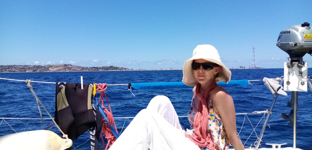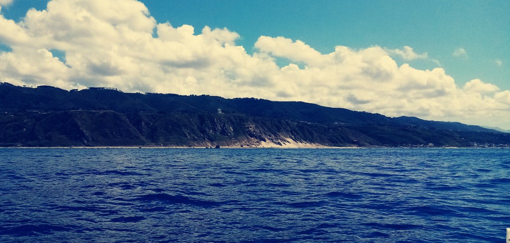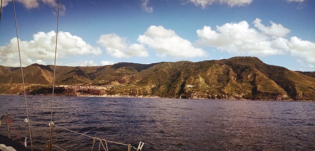Le vent nous oblige à faire cap vers la Sicile et en particulier la ville de Milazzo. Le paysage est étonnant et bouscule nos certitudes. Nous pensions trouver une côte désertique et plate. Faux, c’est relativement boisé et surtout de hautes collines et montagnes surplombent le littoral. Je pense à cette terre austère qui a vu tant d’exodes de part le monde. Les italiens et en particulier les Siciliens sont les principaux colonisateurs des USA durant le XXe siècle. Un sentiment de respect nous parcourt à ce moment. Nous voyons cette terre depuis la mer là où des millions l’ont vu en partant, le ventre noué mais le cœur plein d’espérance. Nous pensons au Papa de Doriane, qui a participé lui aussi à cette quête vers son propre destin, loin de la rude et belle aridité de ce pays. Nous pensons aussi à sa Maman qui a quitté ses terres plus au nord, en Vénetie. À ma grand mère aussi ou mon arrière grand père, tous deux de Toscane… À tous les gens qui ont dû, un jour, quitter leur pays pour se révéler ailleurs. Par choix ou par désespoir…
