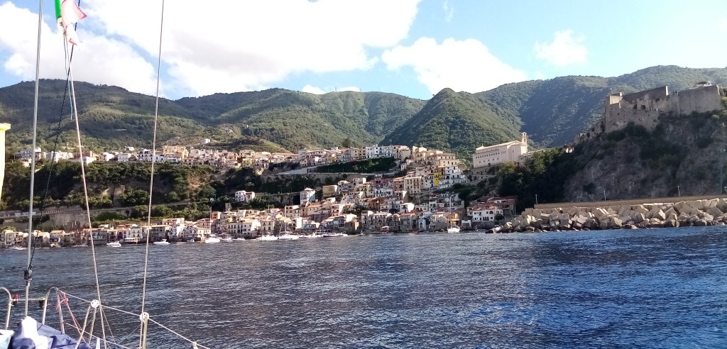 Nous arrivons enfin devant Scilla. Est ce elle qui a inspiré Homère ou l’inverse ? L’escale est trop belle pour ne pas calquer notre odyssée sur celle d’Ulysse. Devant le petit port se dresse le gros rocher mythique chanté par Homère et qui hébergeait un monstre marin. Derrière, et sur tout le littoral, la montagne calabraise tombe dans la mer dans un paysage à couper le souffle. C’est une belle surprise car beaucoup de navigateurs dénigrent la Calabre. Je m’inscris en faux, c’est un pays magnifique.