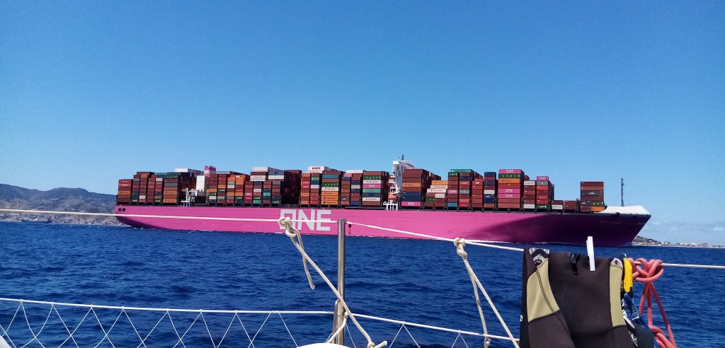 En quittant Scilla, nous découvrons les affres des courants parfois contraires, parfois bénéfiques. Nous avons pris l’option de partir 4h après la pleine mer de Gibraltar pour bénéficier d’un courant nord sud favorable. Et pourtant, ça n’est pas vraiment le cas et avons plutôt un courant de face durant le trajet avec un vent qui monte en puissance au fil de notre navigation. Le vrai problème du détroit est la grande vigilance dont nous devons faire preuve avec le traffic de gros navires dans tous les sens. Nous embouquons le canal des navires venant du sud pour rester au centre du détroit tout en observant avec attention le jeu incessant des ferrys faisant l’aller retour toutes les 15mn entre la Sicile et la Calabre.