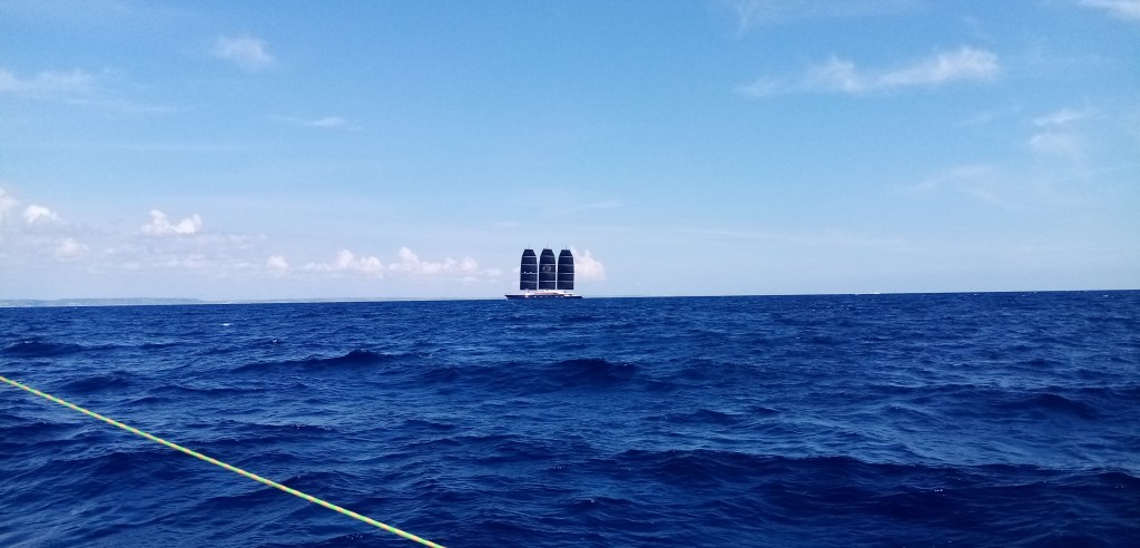 Au loin je distingue un gréement haut avec des phares carrés (voiles carrés sur hunier). Est ce un vieux gréement ? Je prends mes jumelles et je distingue un bateau à l’allure insolite. C’est comme si on avait pris un yacht à moteur et qu’on l’avait affublé de mâts avec des voiles à l’ancienne. Bref il est moche mais singulier.