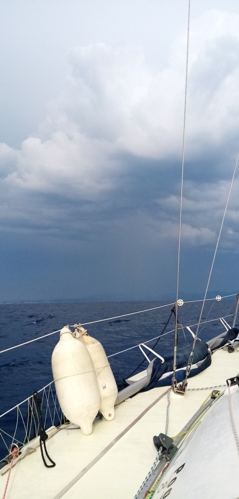 Ça y est je vois les premières îles grecques au bout de 8 heures de mer. L’excitation monte à bord. Hélas, celle ci laisse vite la place à un peu d’inquiétude. De gros nuages menaçants et des éclairs apparaissent droit devant. Je m’en fout, on fonce dans le tas ! Je vais quand même pas changer de route, aller plus au sud et rallonger de 7h la navigation déjà longue de la journée.