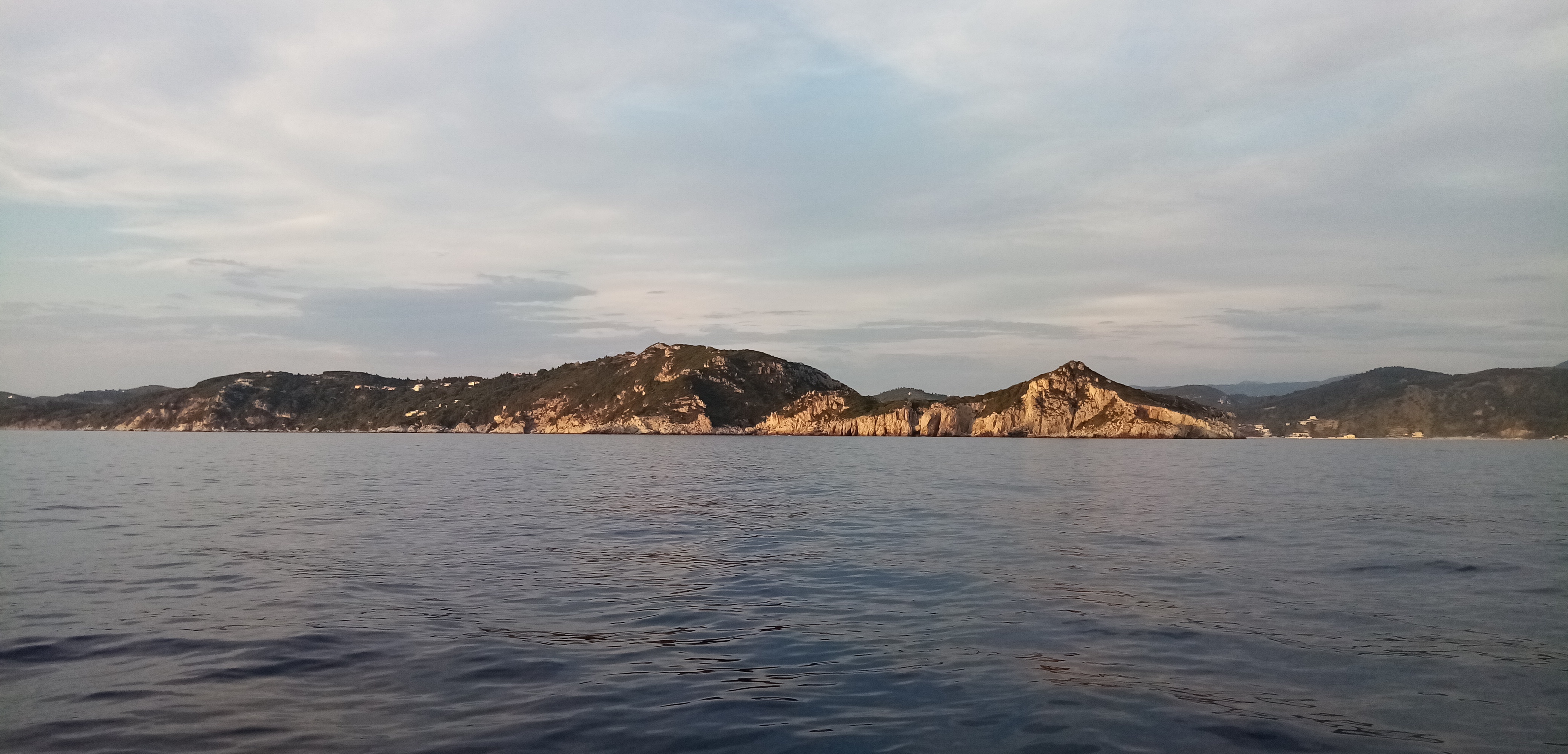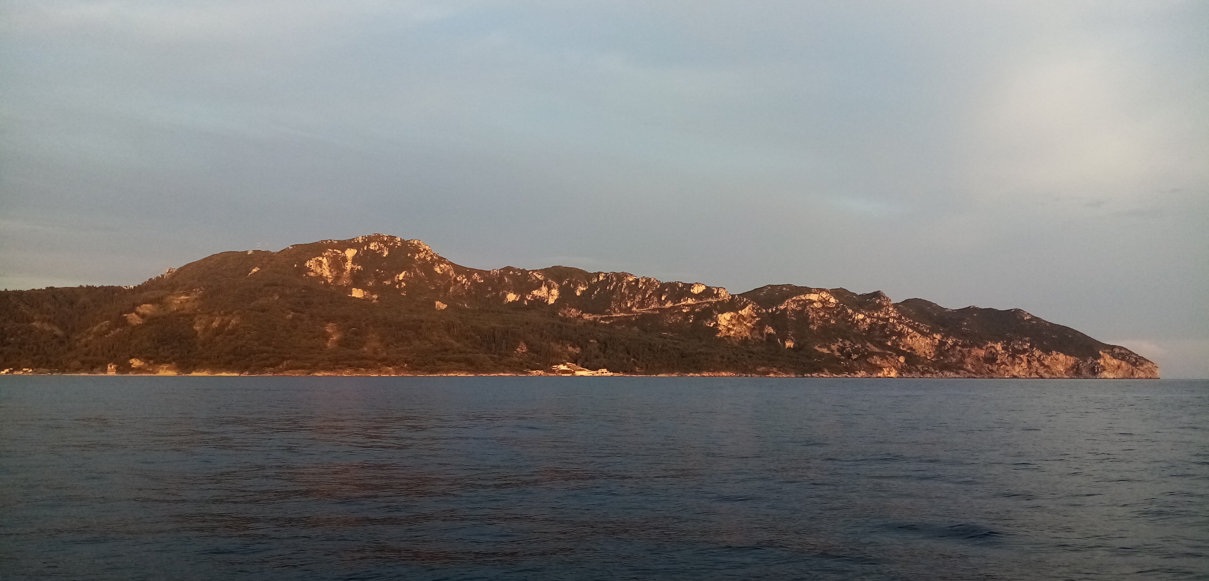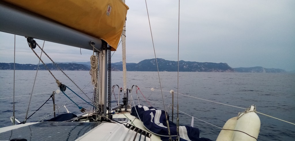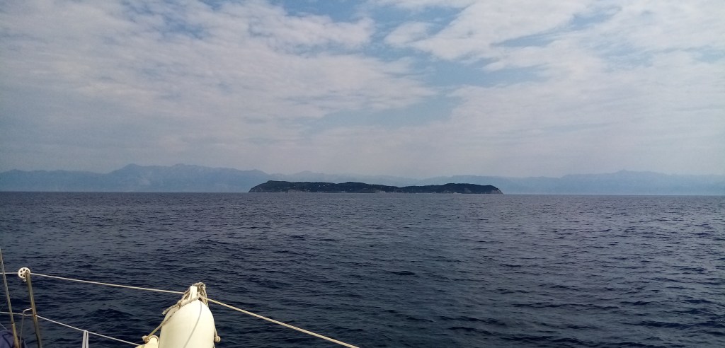 Je dépasse l’île d’Othonoi et arrive bientôt à d’autres petites îles proches de l’arrivée. Je peux apprécier, malgré le temps bouché, la beauté de la côte. Des forêts de cyprès, des falaises ocres et, dans la terres, quelques petites maisons. Le front orageux, avec son accélération de vent, est maintenant passé, place à la pétole. 0 vent. Je mets le moteur pour parcourir les derniers 7 milles. C’est déjà trop, ma philosophie de la croisière m’interdit un usage prolongé du moteur. Mais bien sûr il y a une foule d’autres raisons : ça pue, ça fait du bruit, ça accélère mon empreinte carbone, ça n’est pas efficace (sur Babar je vais a 3.8 noeuds à 1800 tours/MN), c’est cher, ça augmente de façon significative la chaleur intérieure du bateau, c’est pas marin car au moteur on va tout droit sans se soucier de la météo, du courant, bref sans réfléchir (on le voit d’ailleurs avec tous les abrutis qui vont à fond l’été).