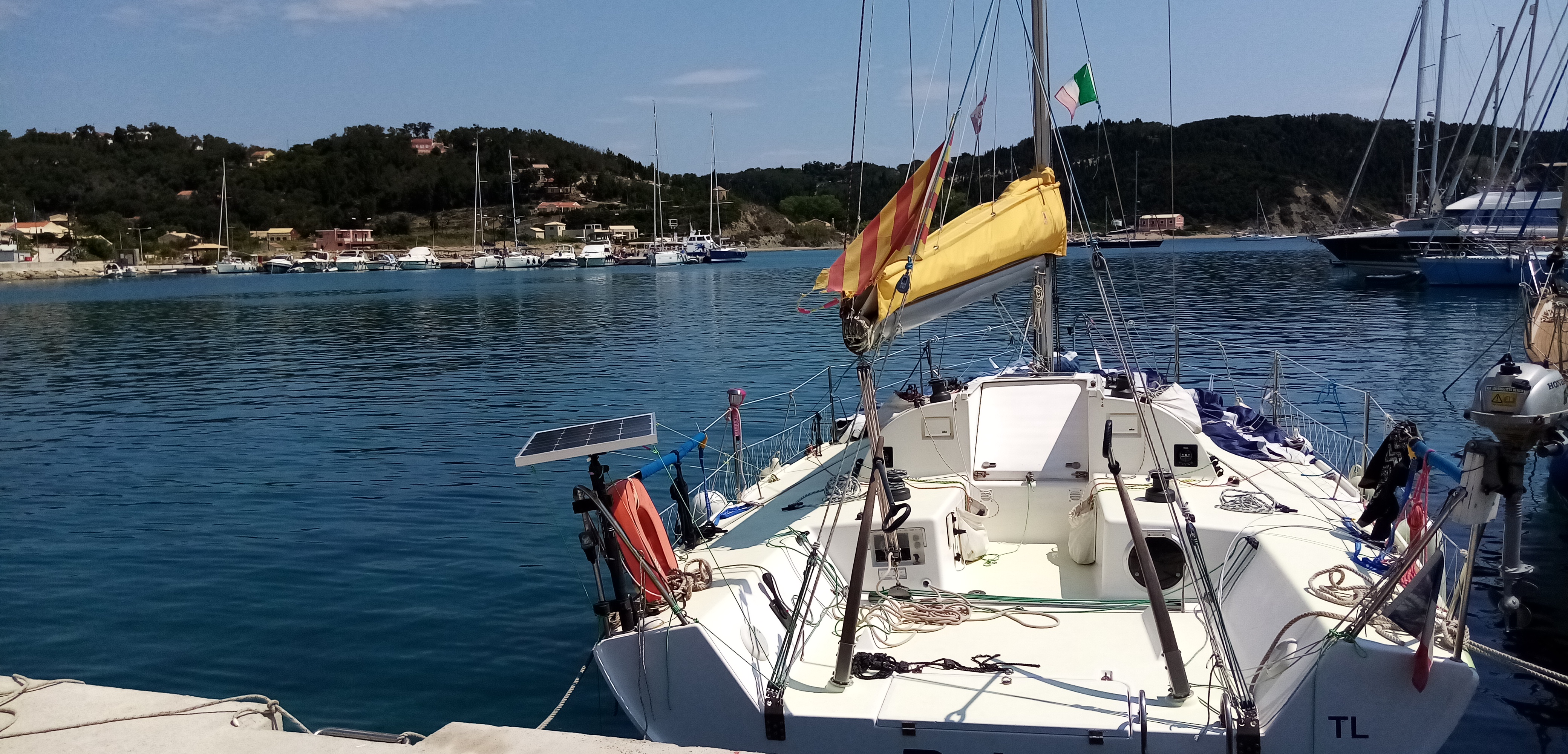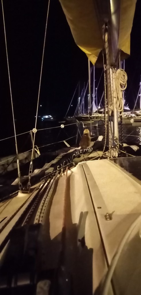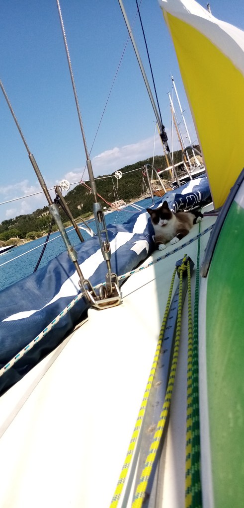 Les premiers contacts avec les grecs tiennent leurs promesses de gentillesse et de calme. Après la France et l’Italie, c’est presque un choc culturel. Après cette petite balade je retourne au bateau pour libérer Solenzu et lui donner quartier libre sur le pont pour la soirée. Comme souvent avec les chats, vous donnez la main, ils prennent le bras et celui ci se met en tête de taper l’incruste sur le bateau voisin d’anglais fort sympathiques.