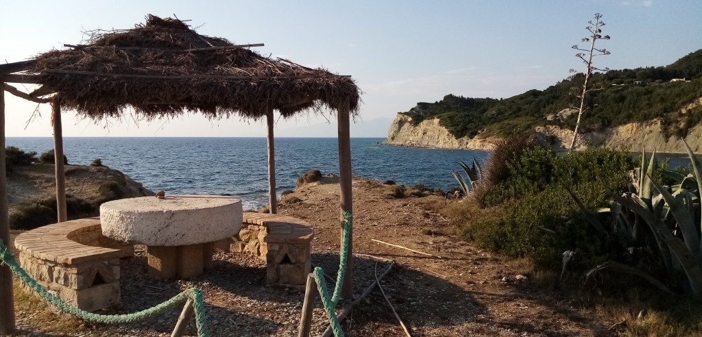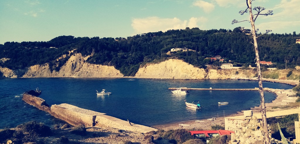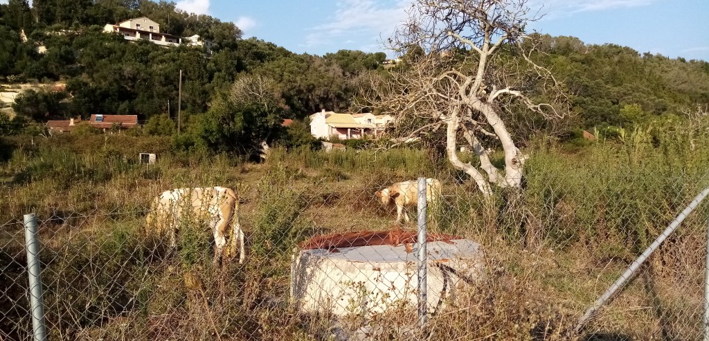 J’ai déjà hâte de rencontrer ce peuple dont on vante souvent l’hospitalité, la gentillesse et une certaine philosophie de vie héritée de leurs ancêtres antiques. Je pars donc en exploration non sans avoir déjeuné dans une fameuse Taverna un tsatziki et un poisson frais avec un bon verre de vin blanc. La note est assez salée, 41€ mais le poisson était beau et de qualité. L’île est un mélange de cyprès, de végétation méditerranéenne, d’arbres fruitiers (citrons, oliviers, figues…), de cultures, de vaches (et oui…) et d’habitations bigarrées parfois en décrépitude.