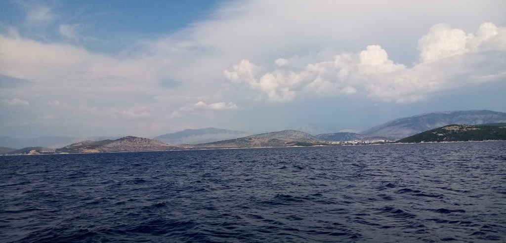 Le vent est pour l’instant aux abonnés absent et je me laisse tranquillement dériver. C’est aussi un bon moyen d’apprécier au diapason temporel de la nature le paysage alentour. Le nord de Corfou se distingue clairement. Ce n’est que végétation dense et quelques maigres maisons dispersées. Je suis excité à l’idée d’aborder ce morceau de Grèce. Petit à petit le vent montre le bout de son nez et me permet d’avancer parfois à 4 noeuds, mais le plus souvent à 3.5. Je pourrais envoyer le spi mais la chaleur me donne l’envie de rester à l’ombre et apprécier doucement la navigation.