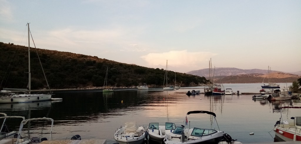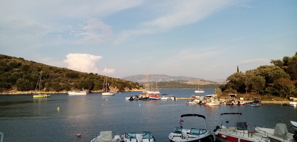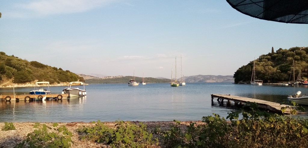 La journée s’annonce sous les auspices du farniente. Je décide de rester ici une nuit de plus. Je me sens trop bien, apaisé. Une légère gueule de bois me rappelle la soirée d’hier avec la liqueur de kumkwat du patron, de trop. Je vais me prendre un café grec à la taverna. J’apprécie ce breuvage, c’est un café plutôt doux et granuleux mais agréable à boire. Après cette parenthèse matinale je retourne au bateau regarder le manège qui commence dans la crique. Une de ces fameuses flotilles fréquentes dans les îles ioniennes du nord vient d’arriver. Il s’agit d’une armada de voiliers, le plus souvent d’anglais, qui naviguent à 10 ou 15 bateaux et écument les spots. Ils déboulent comme une nuée de guêpes, foutent un bordel pas possible et repartent le lendemain. Ils louent ou partent avec leur propre navire, en groupe. Je n’arrive pas à comprendre l’intérêt du principe, il doit certainement y en avoir un mais si éloigné de mes valeurs que je ne capte pas. Je voulais aller à terre boire une bière, ce sera pour une autre fois…