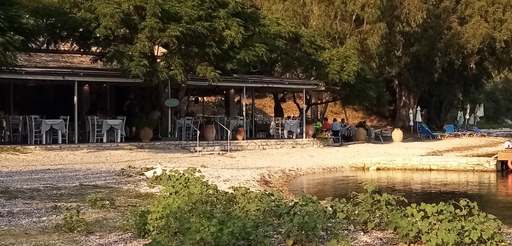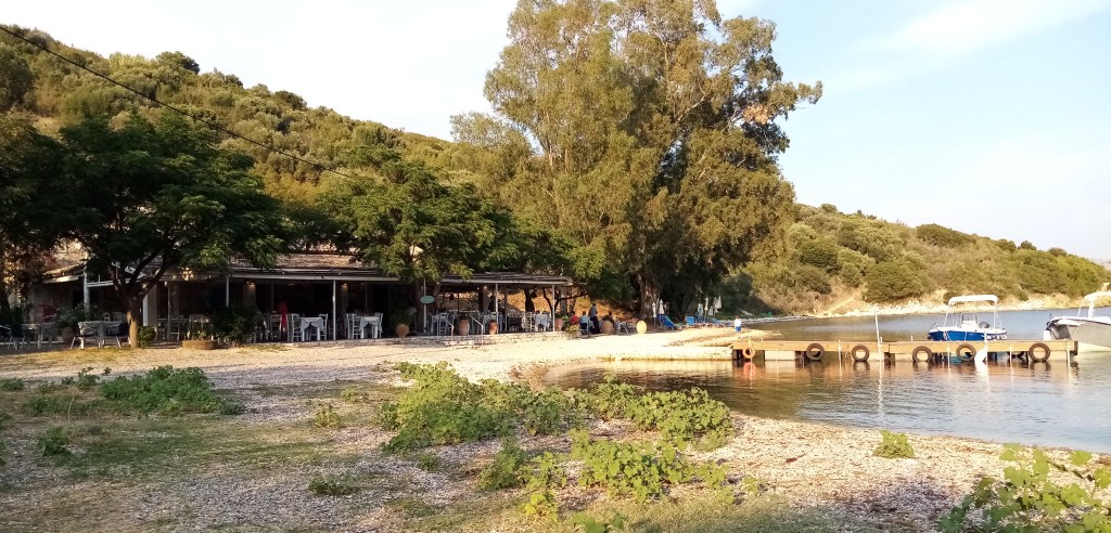 Dommage que je ne puisse m’arrêter ici mais je sens que d’autres trésors sont à découvrir. Je décide de continuer un peu plus loin. J’arrive bientôt dans un paradis tel que je l’imaginais en Grèce. Une petite crique, calme de toute houle, entourée d’oliviers, de cyprès, d’eucalyptus et, au fond un petit hameau avec quelques barques tirées au sec et des Tavernas authentiques au bord de l’eau. Je m’avance au maximum de la rive et pose doucement l’ancre par 3m de fond. Il me faut un moment pour comprendre où je suis. Oui le paradis est terrestre, il est dans ce pays. D’ailleurs les populations antiques le croyaient aussi car la vie après la mort se passait au delà du Styx, dans les enfers et ce n’était pas un doux endroit…