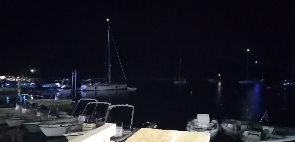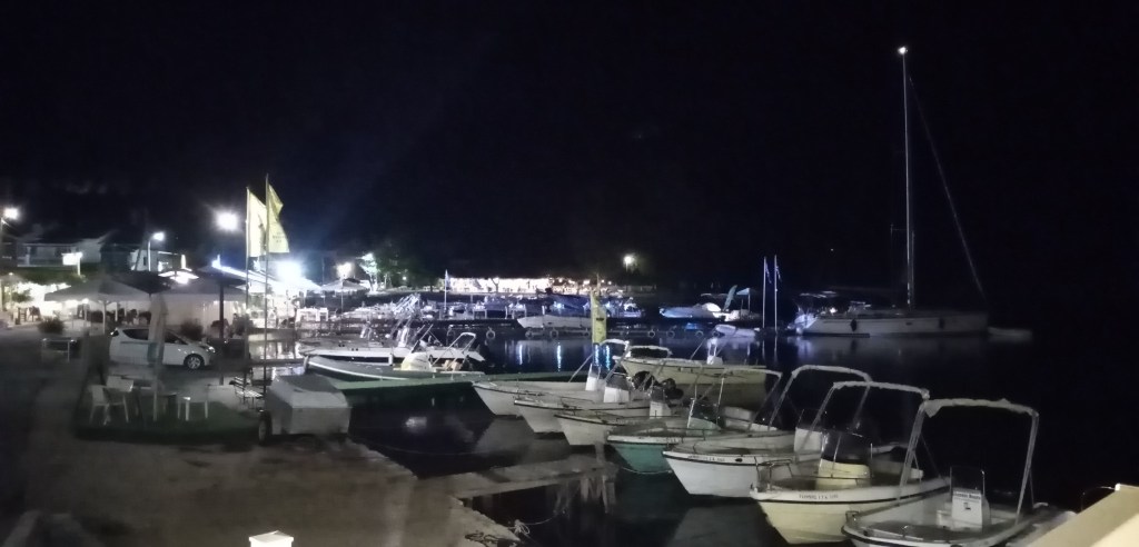 Je vais rapidement me balader pour découvrir de plus près cet endroit. Tout est un peu désuet, sans clinquant ni bling bling, une grève sert de plage municipale où des gamins barbotent devant leurs grand-mères, plus loin sous les eucalyptus des transats et parasols, oh pas bien nombreux à peine une dizaine, permettent à des locaux de prendre un léger bain de soleil et de mer. Je me cherche un endroit pour dîner ce soir et jette mon dévolu sur une Taverna un peu au-dessus du maigre port. La soirée se passe douce et enivrante.