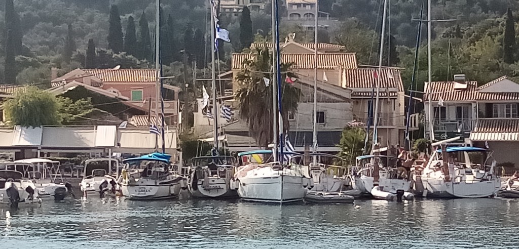La chaleur commence à devenir dure dans le joli port de cette petite île insolite. Pour chercher un peu de frais je vais me prendre le traditionnel café à l’ombre des cyprès. Rapide conciliabule avec moi même, je décide d’amorcer la découverte de l’île de Corfou par son côté nord et est. La météo ? Toujours pareil, vent de nord à nord ouest qui se lève vers 14h. Il est midi, je pars quand même avec pétole, non sans avoir salué le personnel de la Capitainerie pour la qualité de leur accueil.