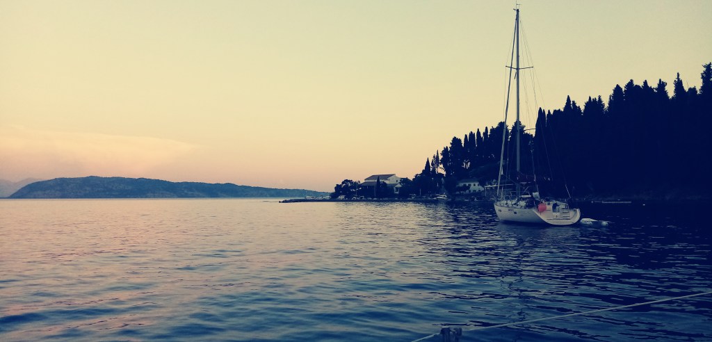 La fin de journée arrive, je me glisse doucement dans une eau d’une rare douceur pour me rafraîchir d’une chaleur encore intense. Je reste 30 minutes à barboter et rejoindre le rivage où une femme polonaise, ayant aperçu Solenzu sur le bateau, me montre des photos de son chat resté en Pologne pour les vacances. Sans intérêt mais sympathique rencontre. Je retourne au bateau prendre ma douche pour aller ensuite un peu plus loin vers un tout petit port de barques prendre un verre à la Taverna du coin. Hélas, elle est fermée et sur le retour je suis appelé par l’équipage du deuxième voilier. C’est un couple d’italiens mais lui est français. On discute ainsi sur la Grèce, moi sur mon annexe et eux sur le pont de leur voilier.