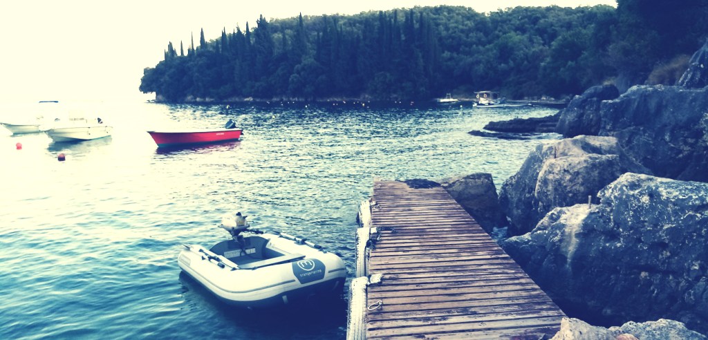 Place à l’ormos suivant distant de… Juste derrière ! Changement de décor, après celui de la veille, nature et authentique, j’arrive dans une large baie avec au sud une forêt et des barques locales à des bouées et sur le reste de la baie une longue plage avec parasols et Tavernas. En gros le tourisme de masse à la grecque. Mais rien à voir avec une plage du même type en France. Ici tout est dans la mesure. Pas d’immeuble mais de petites maison au style désuets. Pas de brasseries ou glaciers géants mais 3 ou 4 Tavernas en bord d’eau. Personne sur la plage les uns sur les autres. Une bonne ambiance sympathique comme un bord de mer de méditerranée français d’il y a 70 ans. Je mouille l’ancre là aussi au plus près de la plage et pars en exploration avec l’annexe, sans moteur, pour ne pas foutre ma pagaille parmi les nageurs. Je pense qu’il y a comme un pacte moral ici. On fout pas le bordel même s’il n’y a aucune interdiction pour nous empêcher de le faire…