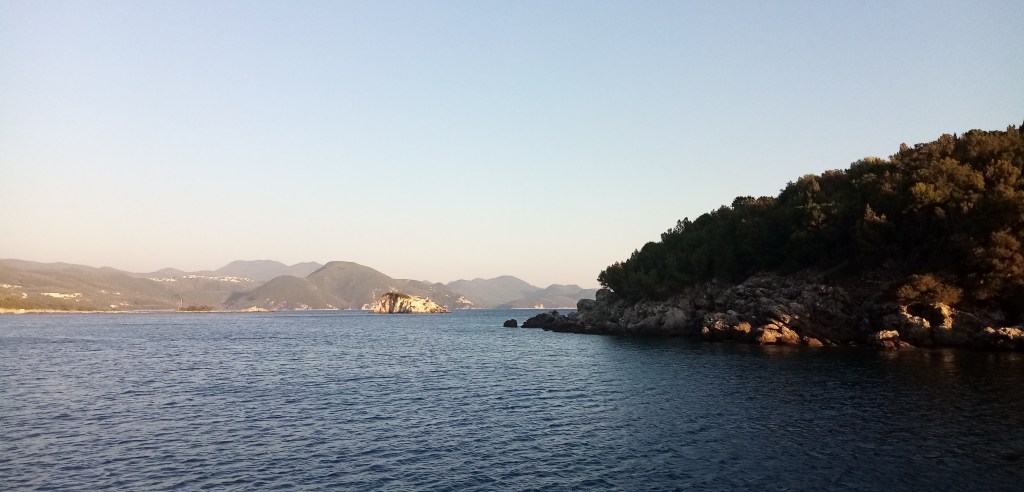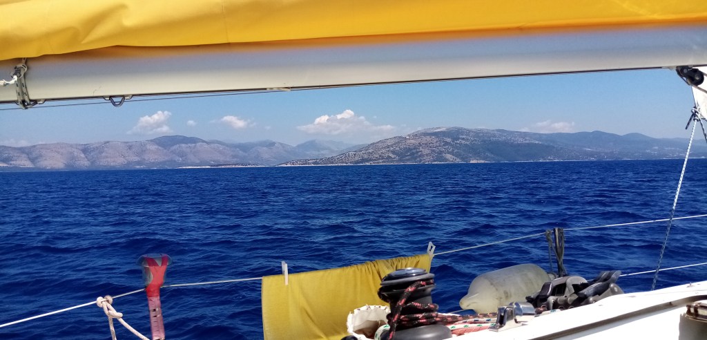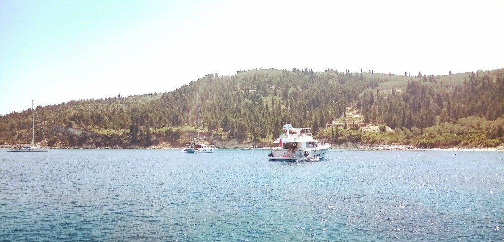 Je me réveille tranquillement et relativement tôt pour aller faire un tour à terre en exploration. Depuis la mer le coin est idyllique. Hélas à terre, les affres de la vie terrestre ont corrompu les lieux. Poubelles éventrées, Tampax, serviettes hygiéniques, merde et papier wc… Un vrai dépottoir à ciel ouvert. J’en ai la nausée. Vite retourner au bateau et reprendre la mer. En mer, tout est nettoyé. Oh bien sur, on voit de façon très nette les conséquences de la société de consommation, mais l’air, l’eau, le vent, tout est pur. Cap sur Paxos.