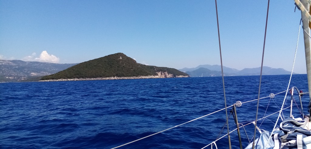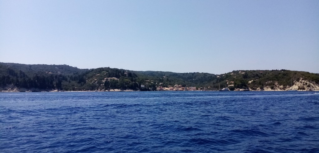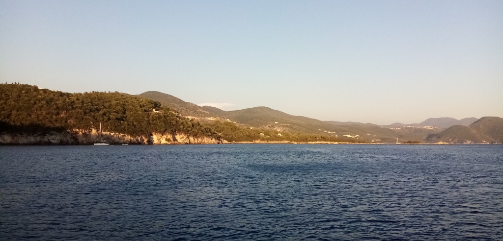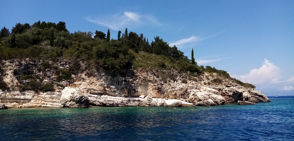 Je mets un peu de temps pour arriver à cette île car je dois louvoyer face à des vents contraires. En vue de l’île le vent du sud fraîchit. Je peux contempler la côte Est de Paxos, de toute beauté. Encore ces forêts de cyprès et, pour la première fois, aussi des forêts de pins maritimes qui ressemblent à des sapins de forme conique. Étrange. Et des oliviers aussi, de culture, car je sais que les olives de Paxos sont renommées.