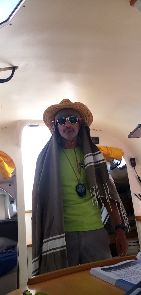 Pour l’instant le vent est quasi nul, nous faisons du 1 noeud, mais nous sommes toujours mieux ici, en mer, qu’au port où l’étuve fait sa dure loi. Impossible de négocier avec la chaleur. Les peuples du nord ne peuvent pas comprendre qu’avec la chaleur aucun effort n’est réellement possible ni aucun échappatoire. Avec le froid, on se couvre, on fait du feu… Avec la chaleur, nul endroit ne peut vous sauver. Pour ceux qui n’y sont pas habitués, cela peut être source de panique. En tout état de cause nous sommes mieux en mer, à l’ombre de la voile à se laisser glisser avec le peu de vent disponible.