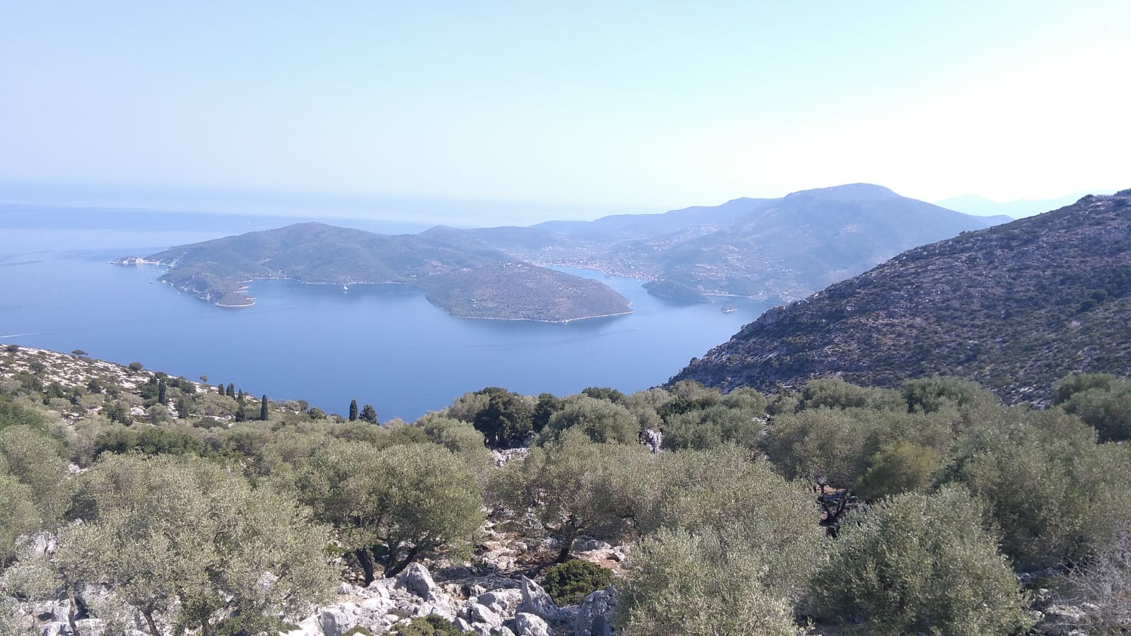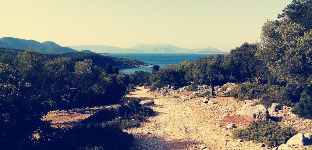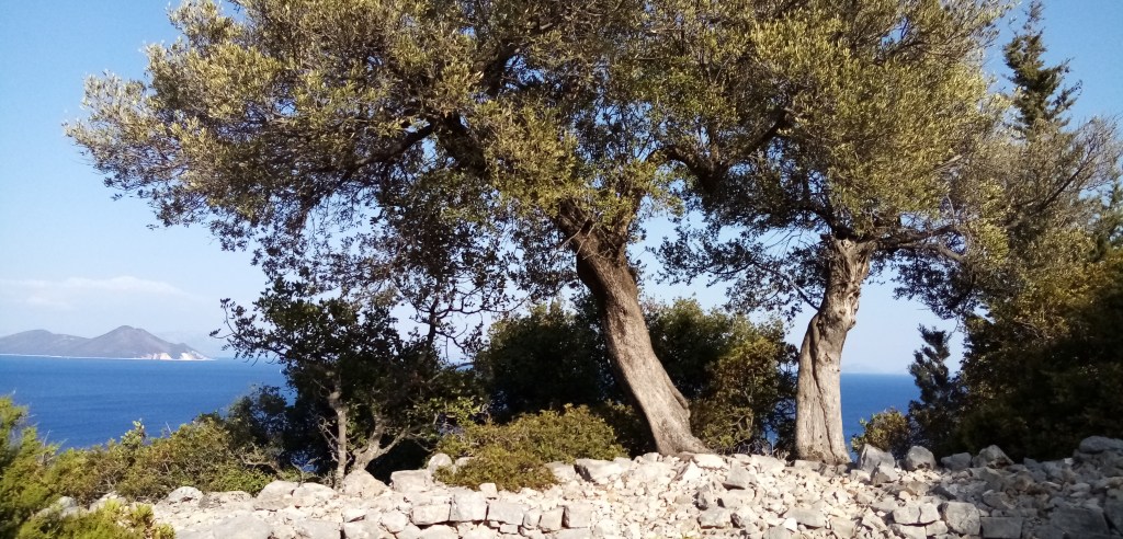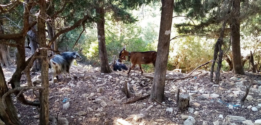 Curieux de découvrir cette si fameuse et étrange île, nous commençons notre itinérance le lendemain par une balade dans la forêt vers un joli petit monastère entouré d’oliviers centenaires. Nous découvrons de nombreux champs d’oliviers au milieu de la rocaille et des chèvres sauvages. L’endroit semble empreint d’un certain mysticisme antique. On imagine voir surgir d’un buisson le dieu Pan jouant de la flûte. Nous sommes, comme souvent, seuls au monde avec cette très agréable sensation de piquotement au ventre que l’on éprouve face à l’étrange, la solitude et la découverte. La chaleur est presque agréable en ces lieux, à l’ombre des arbres, un léger souffle nous rappelle la proximité de la mer qui se découvre tantôt au détour d’un chemin à travers la végétation. Tous les sens sont en éveil, l’odorat est très sollicité lui aussi avec un condensé d’essences méditerranéennes agrémentées d’un nouveau venu, moins concentré sur les côtes occidentales, le fameux cyprès. Le jour tombe vite et nous devons retourner au port où nous attendent patiemment Babar et Solenzu.