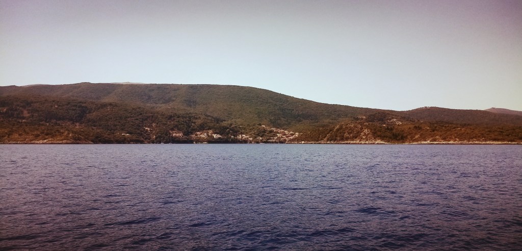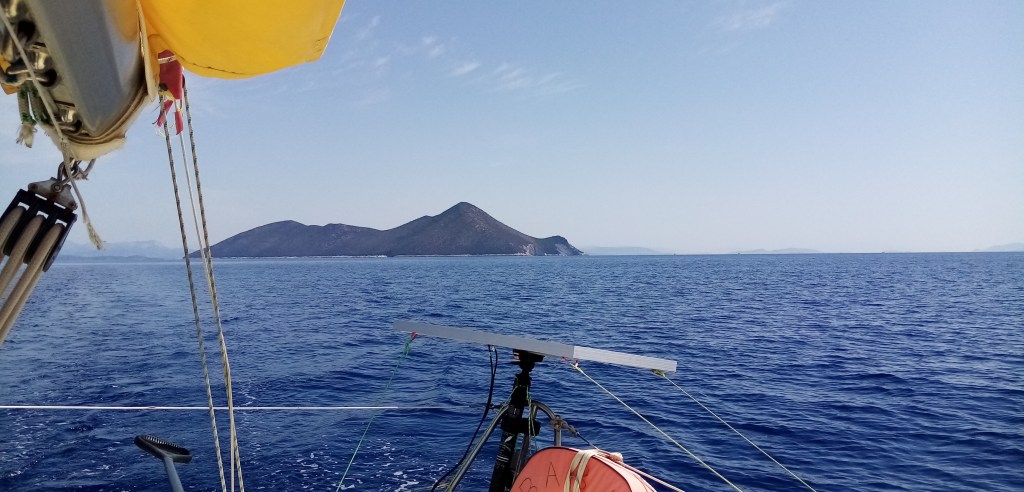 Nous laissons derrière nous Kastos, l’une des plus belle escale de notre croisière, avec un pincement au cœur, mais avec une soif toujours vive de découvertes. La navigation de 12 milles s’annonce tranquille car nous arriverons avant la montée du vent dominant de l’après midi. Nous croisons bientôt l’impressionnante île d’Akotos plantée au milieu de ce grand bassin des Ioniennes du sud, entre Kalamos et Ithaque. Nous pourrions nous y arrêter mais nous avons encore tant de choses à voir.