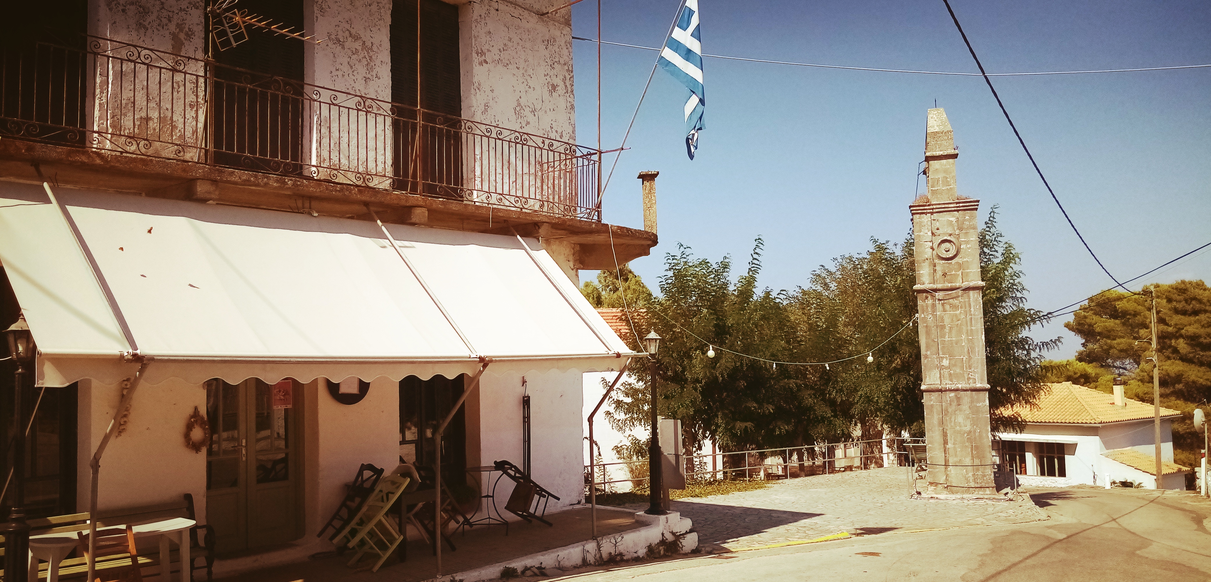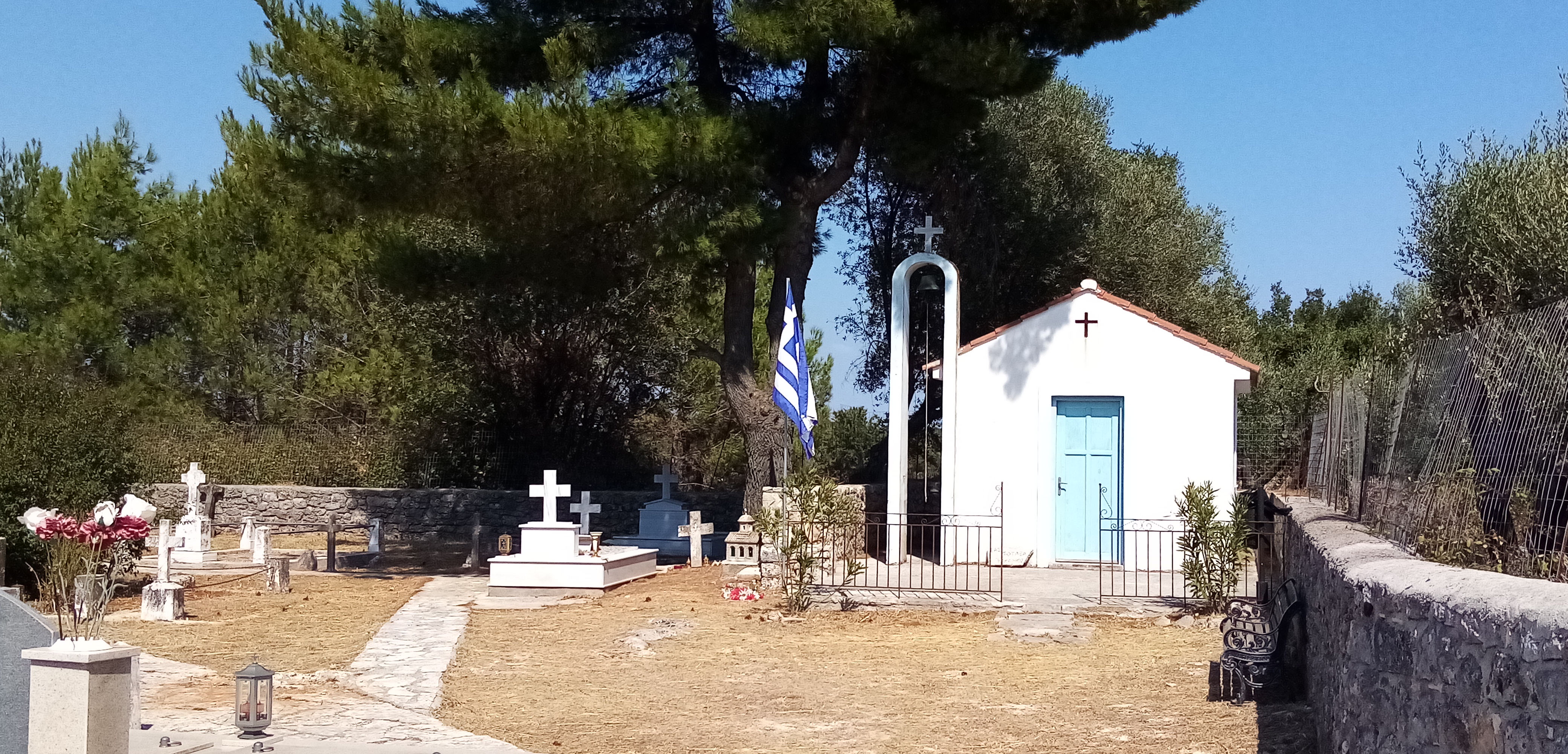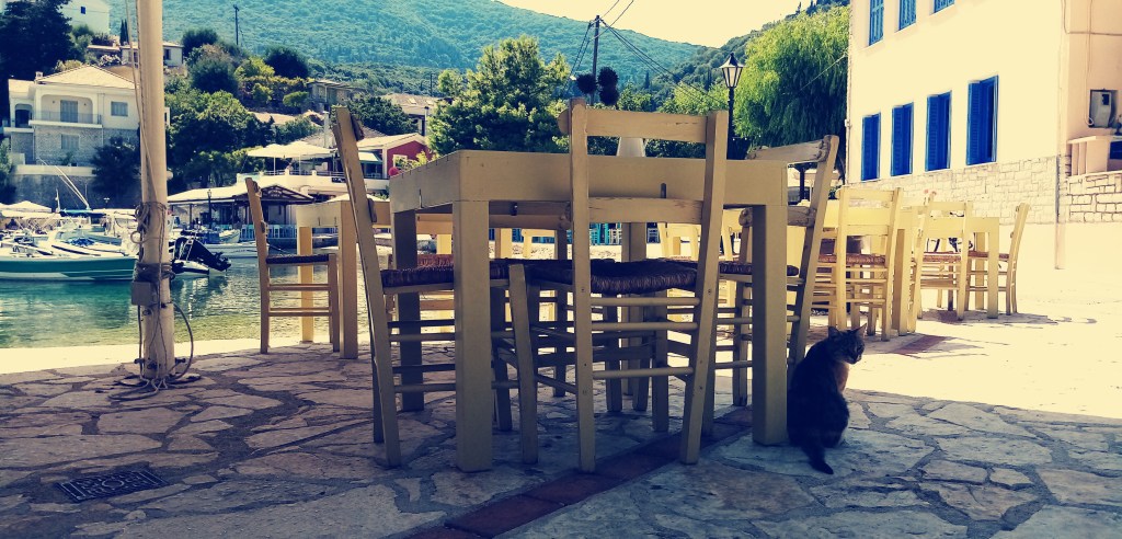 Nous continuons notre périple sur les routes d’Ithaque en direction de zones montagneuses, toujours sans croiser le moindre véhicule. Nous arrivons bientôt à un solitaire et joli petit cimetière perdu au milieu des oliviers et des chèvres. L’endroit est d’un calme quasi mystique avec juste un léger vent qui donne une illusion de vie aux arbres environnants. Peu de temps après, nous traversons un petit village qui semble vidé de ses habitants à l’exception de quelques chats et chatons. Nous restons là un moment, assis sur le banc du bistrot local fermé, à déguster cette quiétude et ce moment hors du temps.