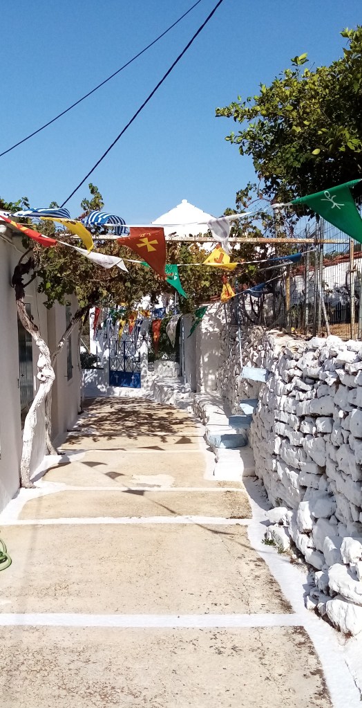 La baie de Kioni est très belle, entourée de montagnes, d’épaisse et odorante végétation, et son petit port-village charmant comme savent le faire les grecs. Les tavernas au bord du quai arborent la même carte mais font la différence par la logistique et le sens inné d’aménagement des grecs. Je réserve pour le soir un dîner à même le sable de la plage. À cet instant, Doriane, qui était allée se balader toute seule en fin de journée m’a offert un joli cadeau authentique que je vais mettre sur la table à carte de Babar en souvenir de ces moments passés.