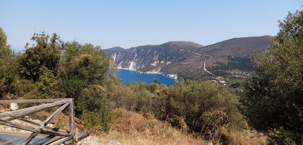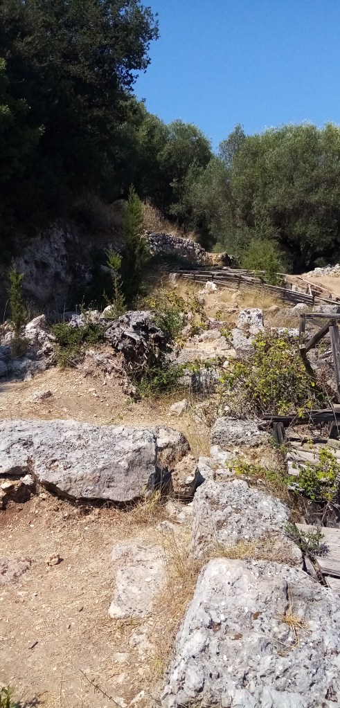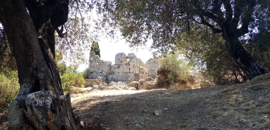 Nous avons loué un véhicule pour arpenter l’île dans tous les coins. Il n’y a qu’un seul loueur sur l’île, il se situe à la capitale Vathy. Comme souvent en Grèce le sens du service est au dessus de tout et le loueur nous amène la voiture directement sur Kioni. Nous devrons la laisser sur le parking le lendemain avec les clés sur le siège conducteur… Nous voici en route direction Frikes, un petit port très exposé aux rafales du vent dominant qui n’a pas beaucoup d’intérêt en soi mais est lové dans un joli écrin de montagnes avec une vallée qui accélère le vent. L’endroit semble un peu à l’abandon parfois, ce qui ne fait que confirmer une impression assez commune en Grèce, comme si certains endroits avaient vu leur population disparaître. Mais l’objectif de cette excursion est d’aller sur les traces d’Ulysse ! Et nous allons au village de Stavros découvrir les ruines de son palais. L’endroit est assez mystérieux car perdu dans les hauteurs de la montagne au milieu d’oliviers sauvages. Une petite mise au point est nécessaire, entendons nous bien, rien ne prouve avec nos connaissances d’aujourd’hui que Ulysse ait bien existé, ni même la guerre de Troie et encore moins l’Odyssée. Mais qu’importe, est ce vraiment nécessaire de rendre la légende vivante ? Ne nous enseigne t elle pas l’essentiel sans qu’elle soit confirmée par des scientifiques ? Car l’histoire d’Ulysse peut nous inspirer pour toutes les situations que nous pouvons rencontrer dans notre vie d’humain, du passage d’enfant à l’adulte, de la nécessaire transformation de nous même pour accéder à un idéal. D’autres, comme moi, y verrons une source inépuisable d’inspiration d’aventures et de découvertes. En tout cas, les ruines de son château ne sont finalement qu’une maigre et bien inutile consolation face au mystère de sa réalité. L’endroit est joli mais vide avec juste quelques pierres et escaliers en granit. Le mythe n’a pas besoin de concret, il doit se contenter de paraboles, d’imaginaire et c’est bien l’essentiel.