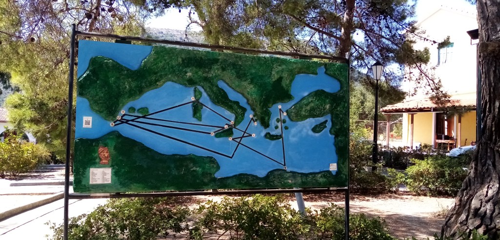 Nous allons déjeuner dans une jolie petite taverne de Stavros après avoir visité les ruines ainsi qu’un tout petit musée de rien du tout (la seule pièce intéressante est un fragment de poterie faisant mention d’Ulysse et datant d’environ 1 000 ans avant JC) . Cela pose question mais nous savons qu’un culte d’Ulysse existait dans l’île avec la présence d’une grotte où des admirateurs laissaient des offrandes. Ceci ne prouve rien sur la réelle existence d’Ulysse, nous avons bien aujourd’hui des clubs de fans extrémistes avec des débilos qui seraient prêts à tout et surtout n’importe quoi pour leur idole.