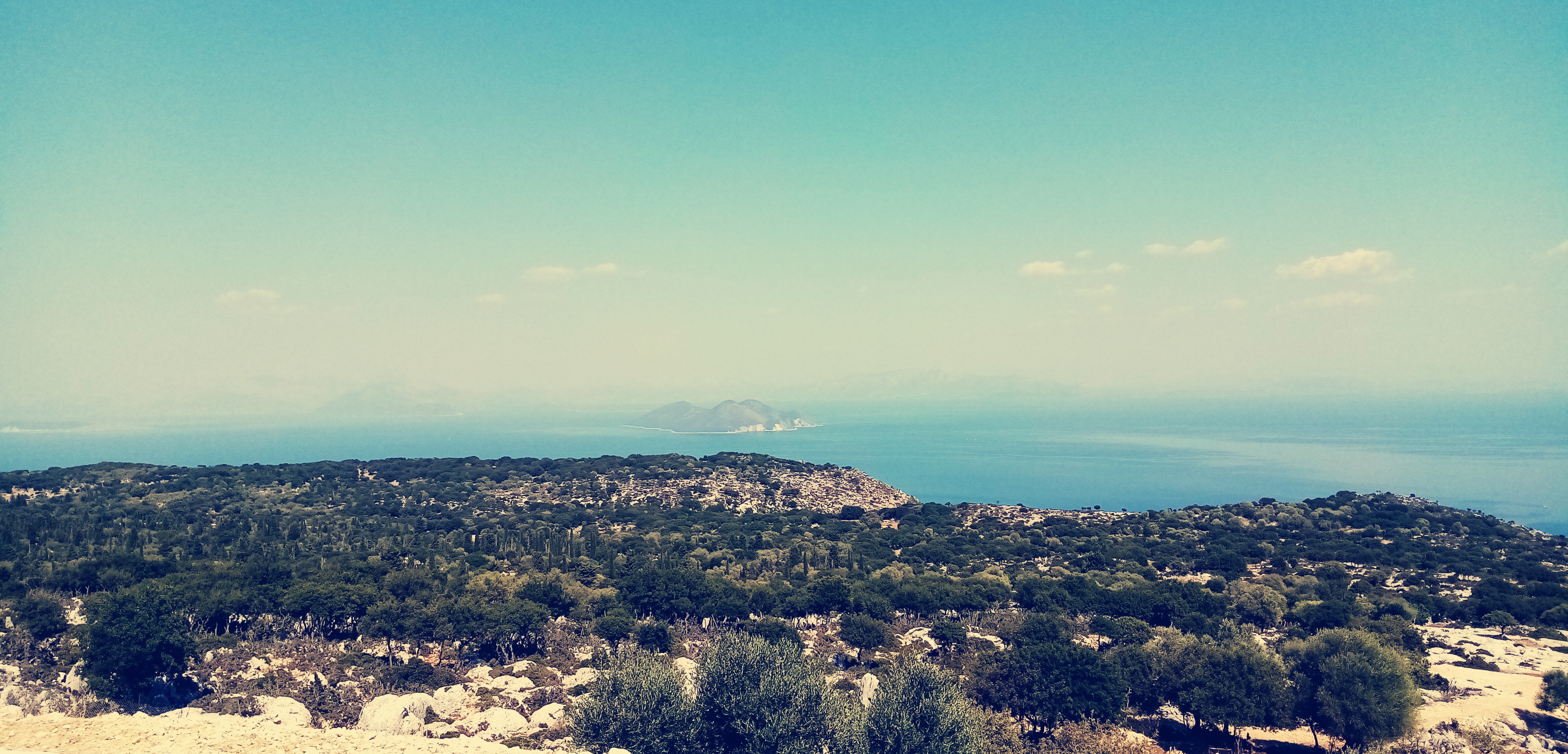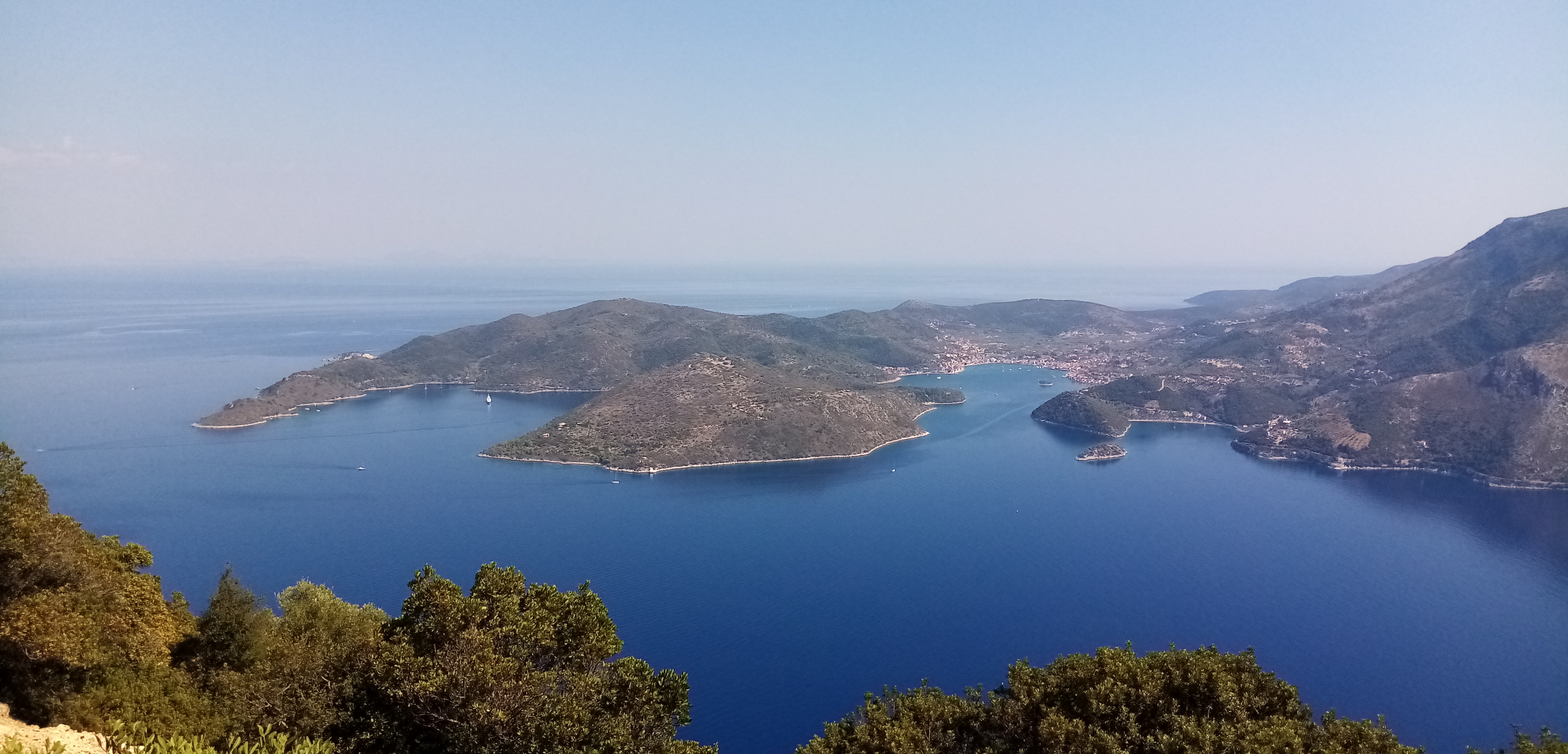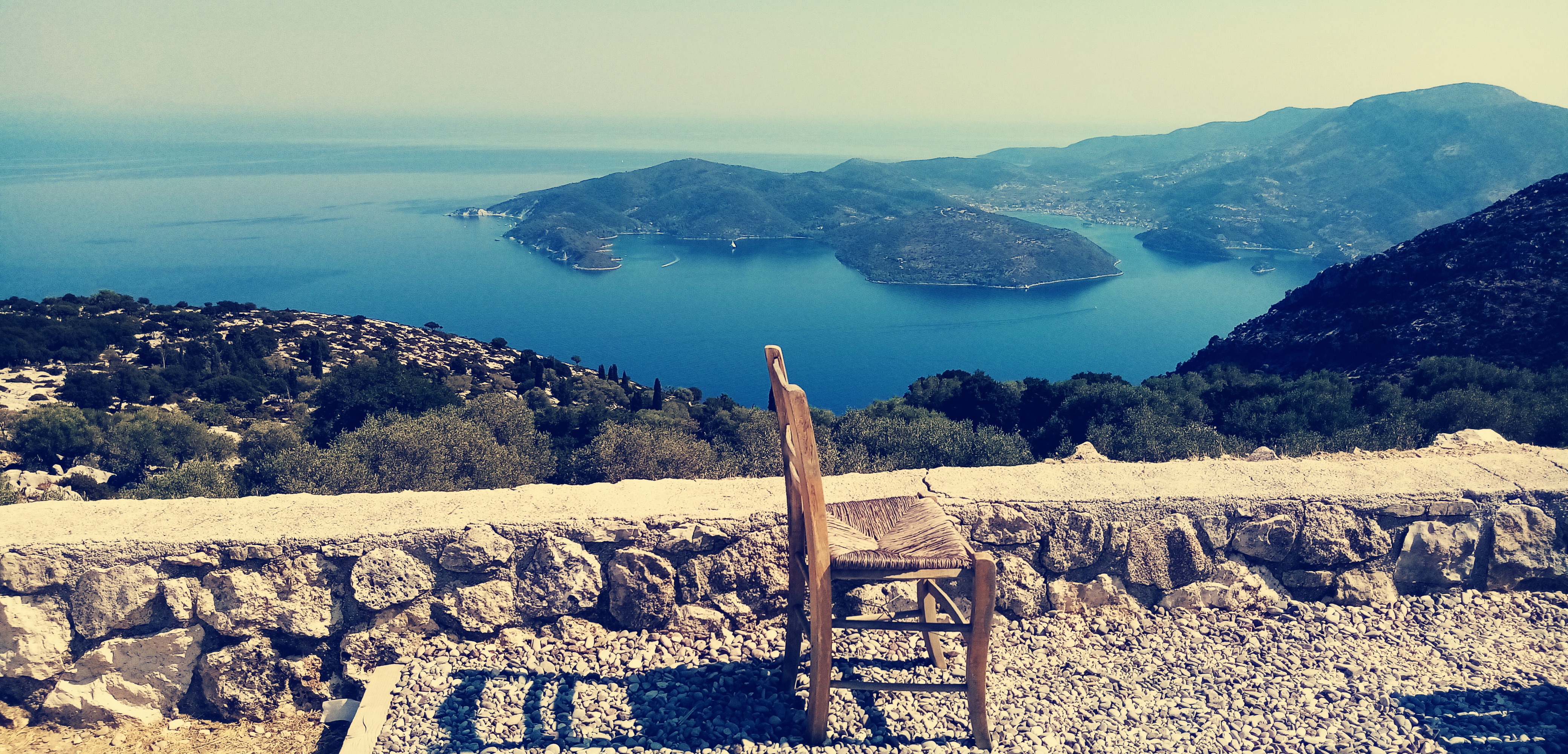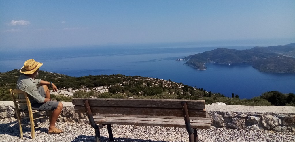 Nous laissons un petit chaton qui aurait bien aimé être adopté mais la route est encore longue pour faire un demi tour de l’île, finalement plus grande que nous le pensions. C’est alors que, soudain, au détour de la route, alors que nous arrivons aux parties les plus hautes de la montagne, une vue extraordinaire s’offre à nous. Comment décrire les beautés époustouflantes qui jaillissent devant nous comme des feux d’artifice ? J’avoue être troublé à ce moment, muet devant le spectacle de grand architecte de la Nature. Je comprends Ulysse d’avoir fait un si grand voyage pour revenir ici. Pour moi c’est un grand voyage pour venir ici tout court, en ce lieu unique, comme un pèlerinage. La vision s’ouvre à toutes les îles Ioniennes du sud jusqu’au continent grec. En contre bas, très loin, on peut distinguer, comme si nous étions des Dieux de l’Olympe, l’écrin créé par Zeus : les nombreuses baies harmonieuses d’Ithaque avec, en leur sein, le jeu des hommes, des voiliers, la ville de Vathy… Tout paraît minuscule mais aussi en harmonie car l’homme semble à sa place, tout petit… Sans avoir fait de dégât, occupé à jouer son rôle sous le regard désinvolte des Dieux. Au delà, sur l’horizon, s’étale la mer vineuse qui épouvantait tant les grecs antiques. Mais malgré cela, sous la parabole d’Ulysse, ils l’ont affronté, le cœur vaillant, jusqu’à influencer l’ensemble des civilisations méditerranéennes et au-delà même, le monde entier.