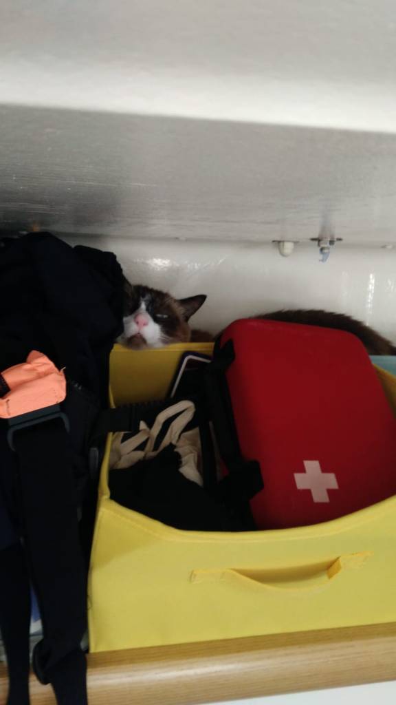 Doriane est en bas avec Solenzu blotti dans son coin et chahutés dans tous les sens. Moi je suis en haut tantôt à la barre tantôt sous pilote. J’ai pris un ris il y a déjà un moment mais je devrais réduire encore pour être plus confort et faire moins souffrir le bateau. Mais tant pis, c’est trop la pagaille pour aller jouer au pied du mat. Je maintiens une allure au plus près du vent pour éviter une gîte trop forte. Tout d’un coup le sac à génois à l’avant est en train de passer à l’eau ayant rompu ses attaches. Je dois y aller ! Je m’attache et fonce à l’étrave sous les paquets de mer pour remettre le sac sur le pont. Rempli d’eau, il pèse lourd et l’opération est pénible. Mais j’y arrive et peux retourner trempé dans le cockpit. J’avoue que, au fond de moi, j’aime bien la baston…