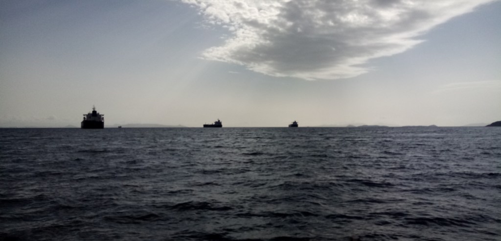 Le cap direct nous est interdit et c’est en tirant des bords que nous essayons péniblement de sortir de cette baie encaissée. Le paysage n’est pas des plus enchanteurs car nous zigzaguons entre de nombreux pétroliers au mouillage.
