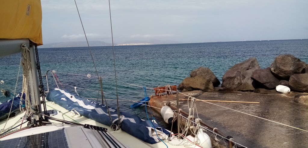 La nuit a été courte avec des difficultés à dormir correctement. Ce n’est pas la faute à la houle, inexistante pour une fois, mais bel et bien l’imminence de la fin de notre si beau voyage. Nous partons à 8h pile pour rejoindre le chantier au nord de l’île de Egina. Une navigation de 23 milles avec une météo orageuse et donc certainement des vents tournants et incertains. Il vaut mieux partir tôt même si nous n’avons rendez vous qu’à 16h devant la darse. Mon instinct me dit que la dernière navigation s’annonce complexe.
