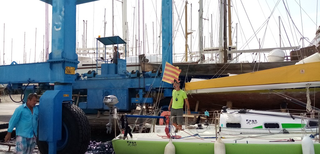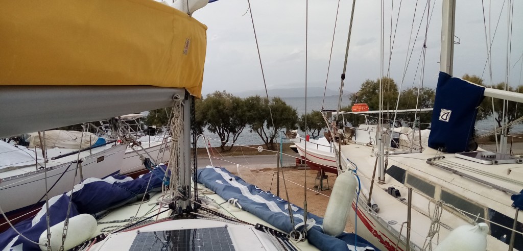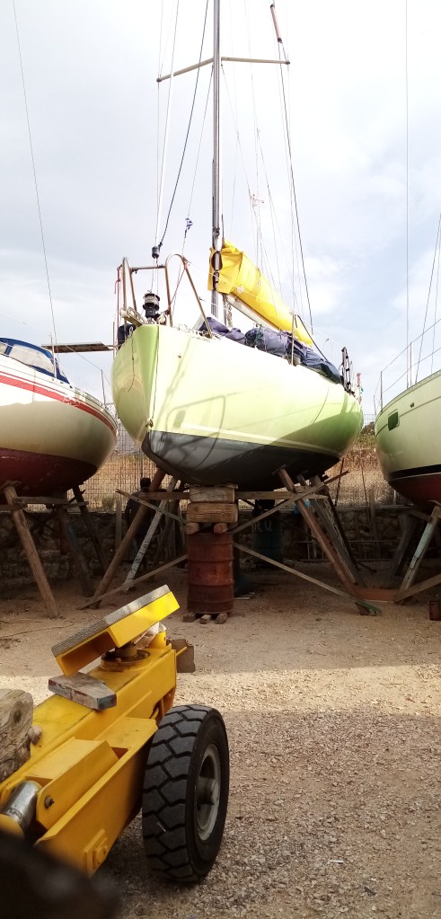 Au large de l’île d’Egine, le vent et la mer se calment enfin. Je peux faire route directe vers le chantier qui nous attend finalement plus tôt que prévu. A 2 milles, le vent se remet à souffler fort et je crains une arrivée dans la darse inconnue. Finalement l’opération se passe bien et nous arrivons à bien nous positionner dans l’axe où nous attendent 2 gars du chantier. Je fais entrer en douceur Babar dans la darse étroite. Ça y est c’est bientôt la fin… Le moment est rempli d’émotion pour nous deux. Je reste sur le bateau pour le levage pendant que Doriane est à terre pour suivre les opérations. Le bateau est soulevé et transporté comme si on l’emmenait à une table d’opération. Nous sommes tristes mais heureux et fiers de ce beau voyage. Voir notre maison, notre refuge, soulevé ainsi et placé sur des rondins en bois, est un moment délicat. L’impression n’aurait pas été la même si je l’avais laissé dans un port. Là j’ai comme la sensation de l’abandonner, lui qui nous a tant donné, qui nous a protégé, qui nous a permis de vivre une aventure unique. Il va rester ici, dans un pays inconnu et lointain, au milieu d’un champs mais, heureusement, face à la mer… Au revoir mon vieil ami, je reviendrai te chevaucher et te rendre ta liberté.