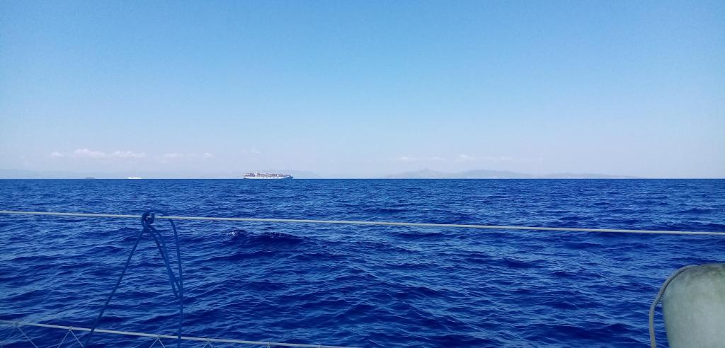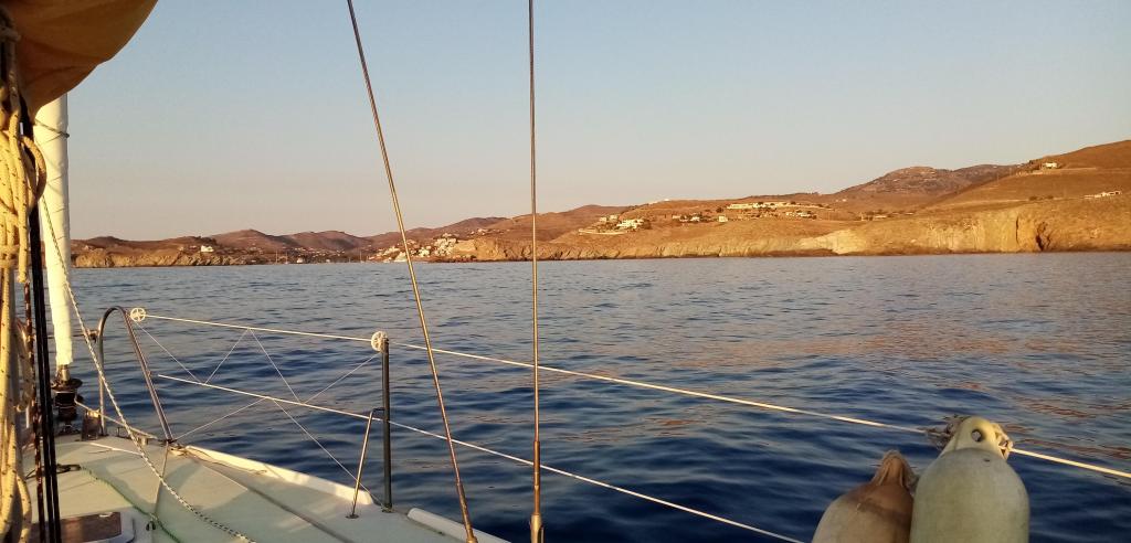 Le vent vient du Nord Est force 3 max, ce qui est plus que confortable pour un début de croisière. Ça y est nous voici dans la fameuse mer Egée qui a alimenté mes fantasmes depuis mon enfance. L’eau est sublime, telle que je l’imaginais, d’un bleu profond envoûtant et secret. Nous arrivons bientôt, au bout de 11 heures en vue du port de l’île de Kea. Pour nous accueillir, comme une mise en garde, l’épave d’un gros navire est abîmé sur les roches de la digue. Nous allons, pour la première fois de la croisière, mouiller l’ancre et culer jusqu’au quai, le fameux amarrage à la grecque. J’aime ce type d’arrivée car c’est un marqueur de liberté cher à ce pays et ce peuple, on arrive, on mouille l’ancre, on s’amarre, on se démmerde, on est libre !