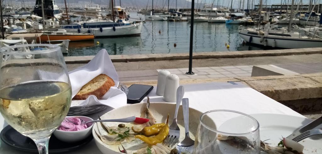 Au climat s’est ajoutée une autre péripétie. Nous décidons, malgré le temps, de quitter la Marina pour rejoindre Egina. Tout est OK, on a fait l’avitaillement, j’ai réglé les droits de port. Je mets le moteur, on s’engage dans l’avant port, j’envoie la grand voile et mets le cap sur l’île d’Egina. Tout à coup un bruit sec métallique claque soudain et la barre devient toute molle. Je sais d’instinct ce qu’il se passe, soit j’ai perdu un safran soit c’est la barre de liaison qui a pété. Je mets en panne (je stoppe le bateau en mettant les voiles à contre), j’ouvre le coffre arrière, bingo c’est la barre de liaison qui a cassé. Plus précisément c’est un diabolo, la pièce qui se fixe sur un des safrans qui a cassé net. Hors de question de faire route ainsi handicapé avec le risque d’orages en mer qui se profile. J’appelle le port, nous revenons à notre place. Après diagnostic, je dois attendre le lendemain l’ouverture des shipchandler pour trouver la pièce de remplacement. En attendant nous allons profiter de l’occasion et de cette escale forcée pour aller visiter à nouveau Athènes. Nous allons d’abord déjeuner dans une taverne spécialisée dans les poissons dans la Marina du yacht club où j’étais allé quelques jours auparavant.
