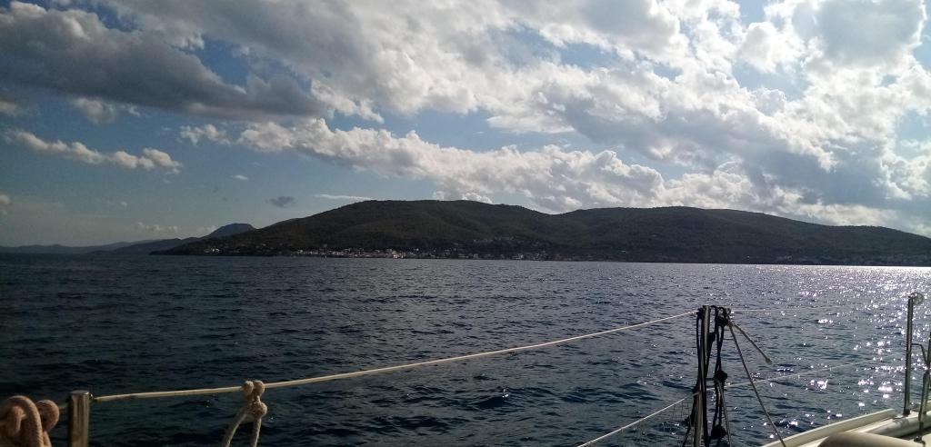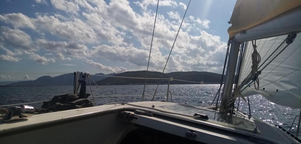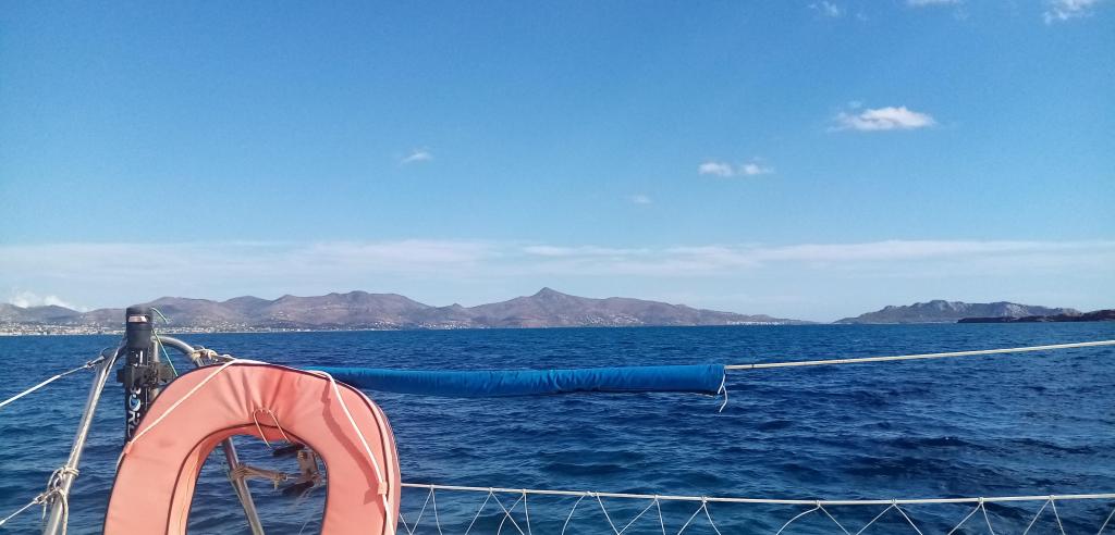 La nuit a été pénible, très humide et pas du tout reposante. Je m’attelle à changer la pièce de la barre non sans difficulté. Nous appareillons finalement à 11h30 de la Marina. Enfin. Le temps est plutôt encourageant avec de belles éclaircies mais une absence totale de vent qui nous oblige à faire route au moteur sous une houle tenace vestige des nombreux orages précédents. Mais quel bonheur total d’être en mer. Il fait beau, il fait chaud et le paysage défile avec grâce et douceur. Il est temps de préparer notre déjeuner, les sempiternels sandwichs de mer. Au large de l’île d’Egina le vent arrive enfin nous permettant de faire route à la voile sous 15 noeuds de vent.