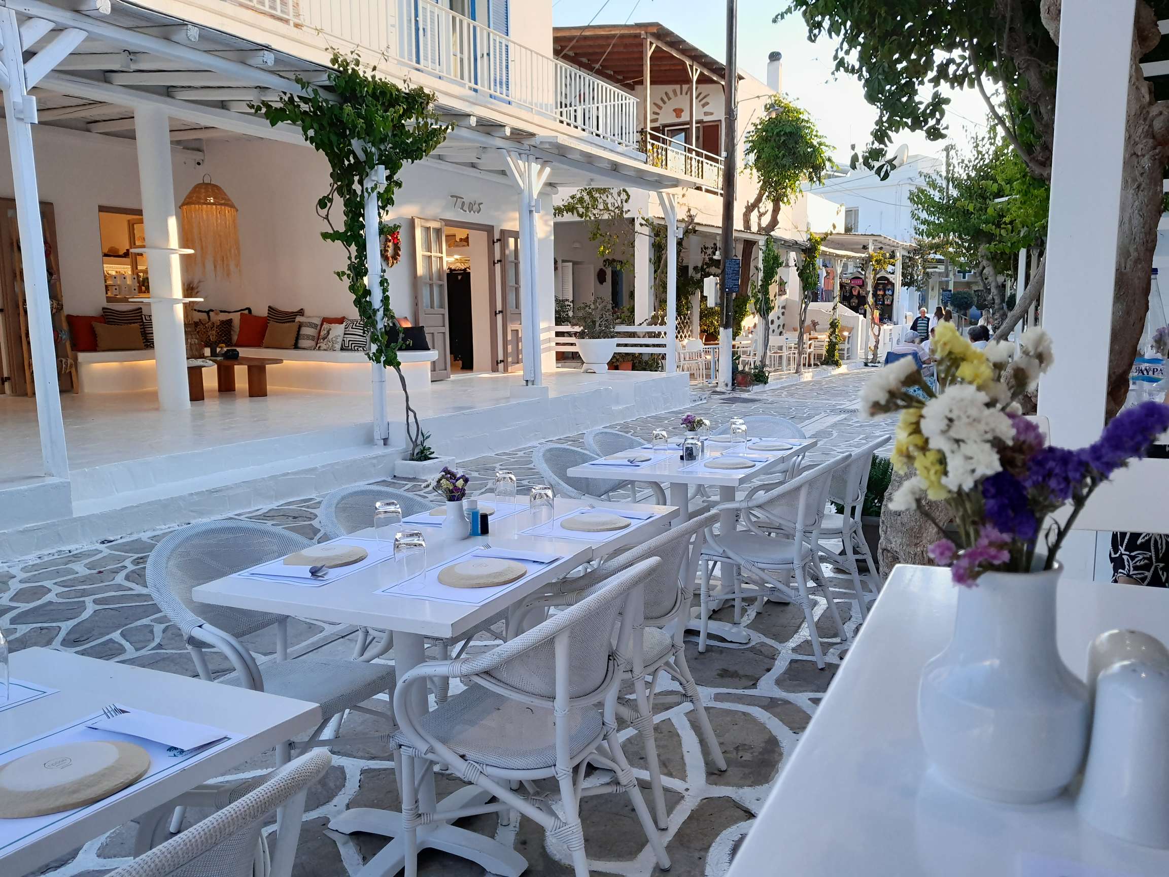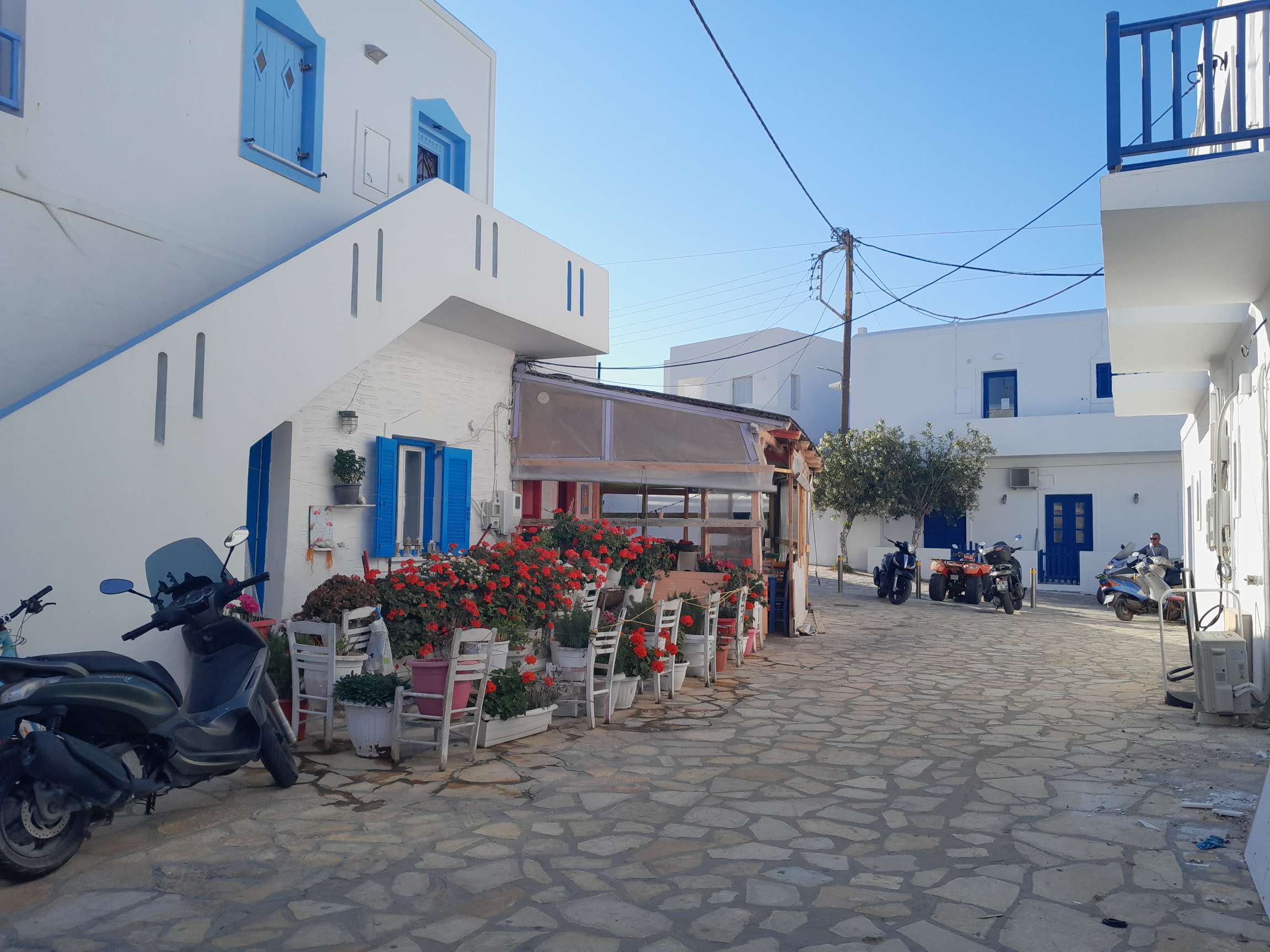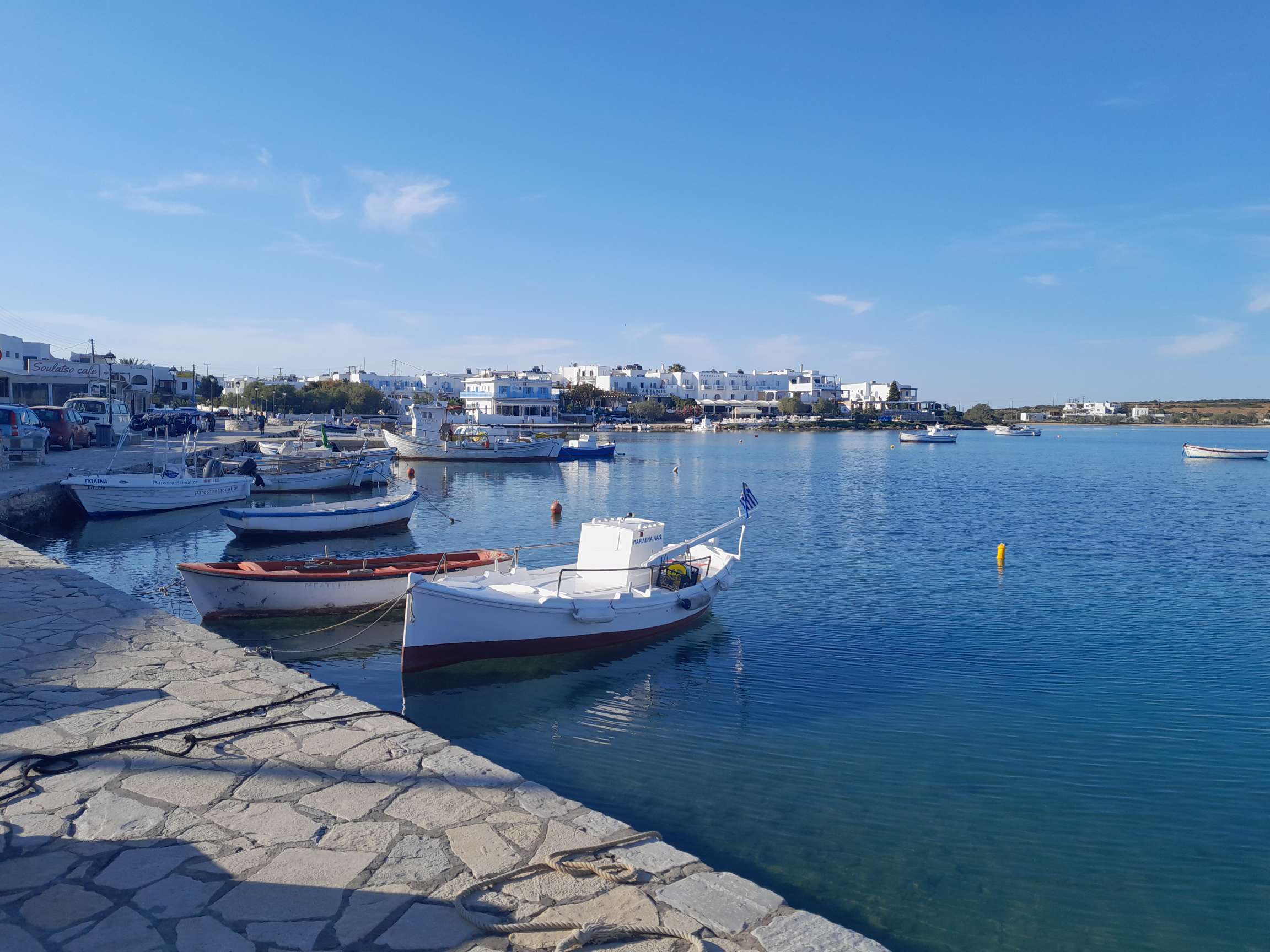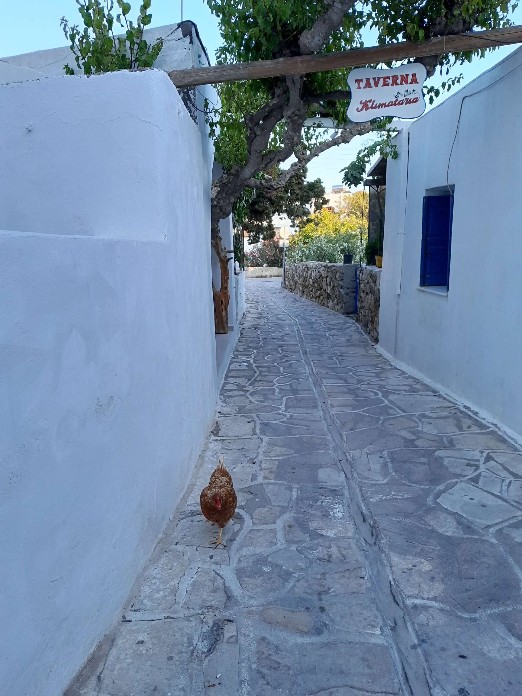 J’ai hâte d’aller explorer cette jolie cité blanche. Ni une ni deux je gonfle l’annexe, puis, après une petite baignade et une douche, je vais avec Babarounet en direction du port qui est finalement assez loin. À bord de mon frêle escif je dois faire attention au trafic incessant du bac qui relie les deux îles. Le port est rempli de petites barques colorées et de caïques (bateau turc en bois transformé en promène couillons) et les habituelles tavernes le long du quai. La petite ville est charmante, toute de blanc, pavée et très propre mais il fleure comme un air de paradis pour riches qui manque cruellement d’authenticité. J’aime bien mais je n’ai pas le coup de cœur. Au détour d’une ruelle à l’écart de la rue des touristes, je tombe nez à nez avec une poule, que fait elle là ? Rencontre insolite. Je vais manger un calamar farci avec un verre de vin et je retourne au bateau.
