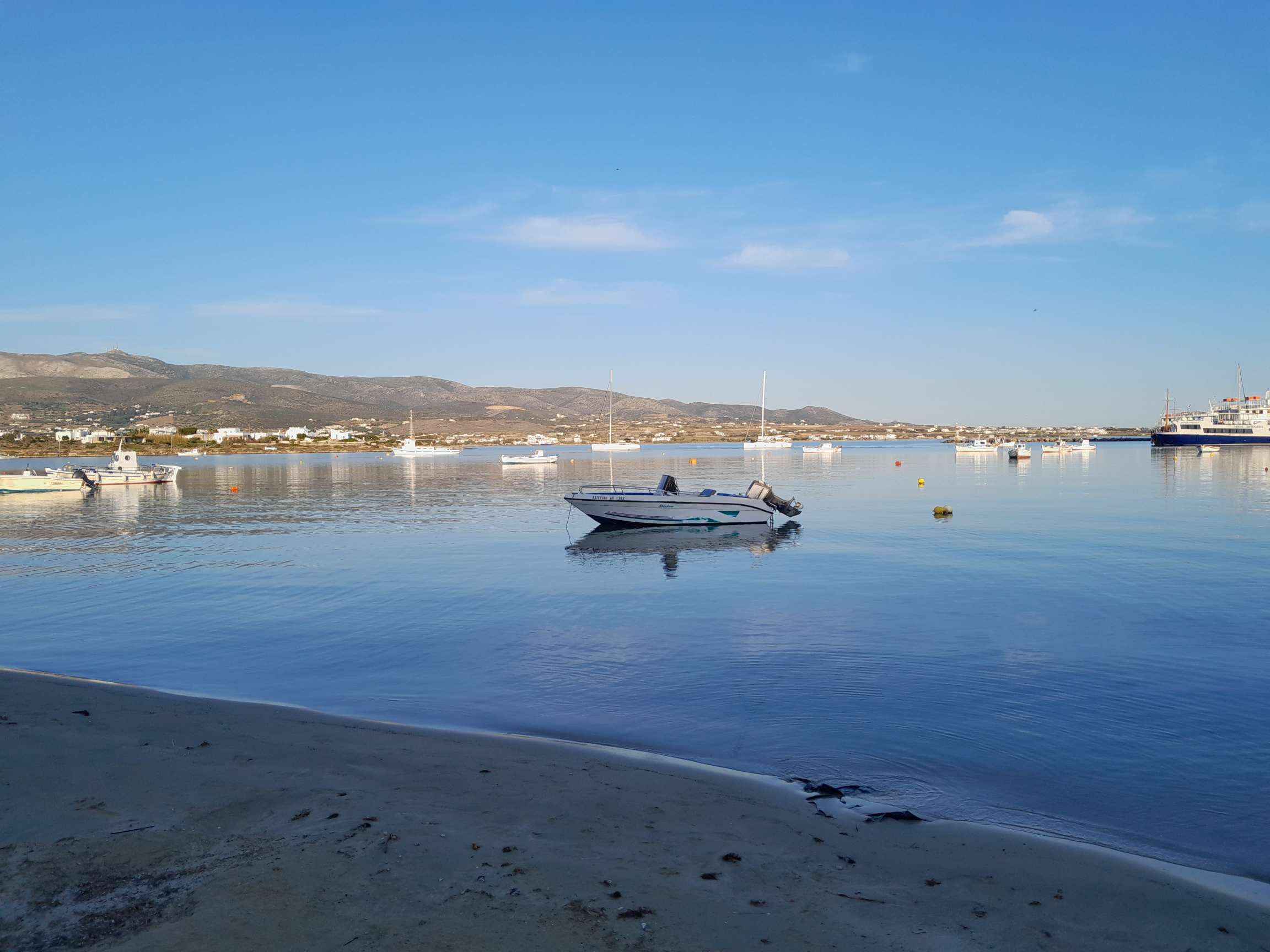 Avec ce vent régulier, forcément la mer s’agite un peu, et, venant du sud et de la mer du large de la Méditerranée orientale, il dépose beaucoup d’humidité sur le pont. À six milles de la passe entre Paros et Anti Paros, le vent, comme je le craignais, s’éteint et c’est au moteur par mer un peu hachée que je continue ma route. Le fameux chenal entre les deux îles se présente devant moi. Je mets le moteur en marche lente, veille sur le sondeur et parfois vais même à l’avant scruter les fonds. Six mètres, cinq mètres, quatre mètres, trois mètres… aïe, je suis d’une vigilance extrême mais ça passe. J’aperçois enfin la petite citée d’Anti Paros et choisis un mouillage au sud qui me permettra de rejoindre le port en annexe. Il s’agit d’une baie ourlée d’une belle plage aux eaux peu profondes.
