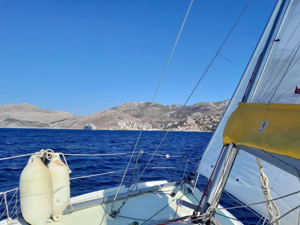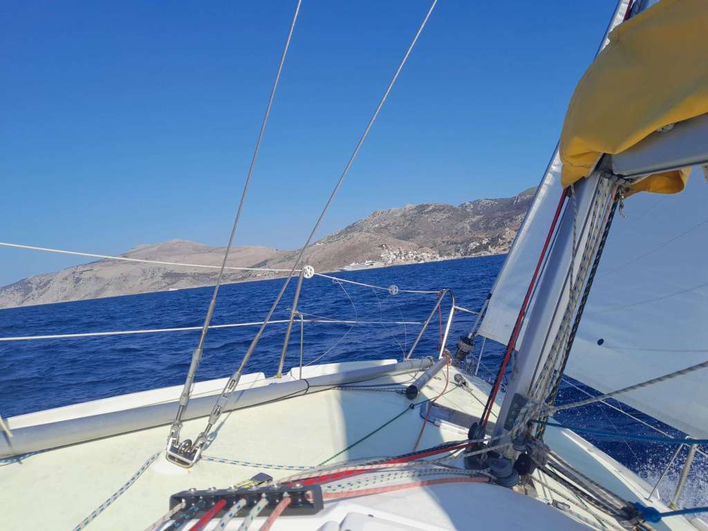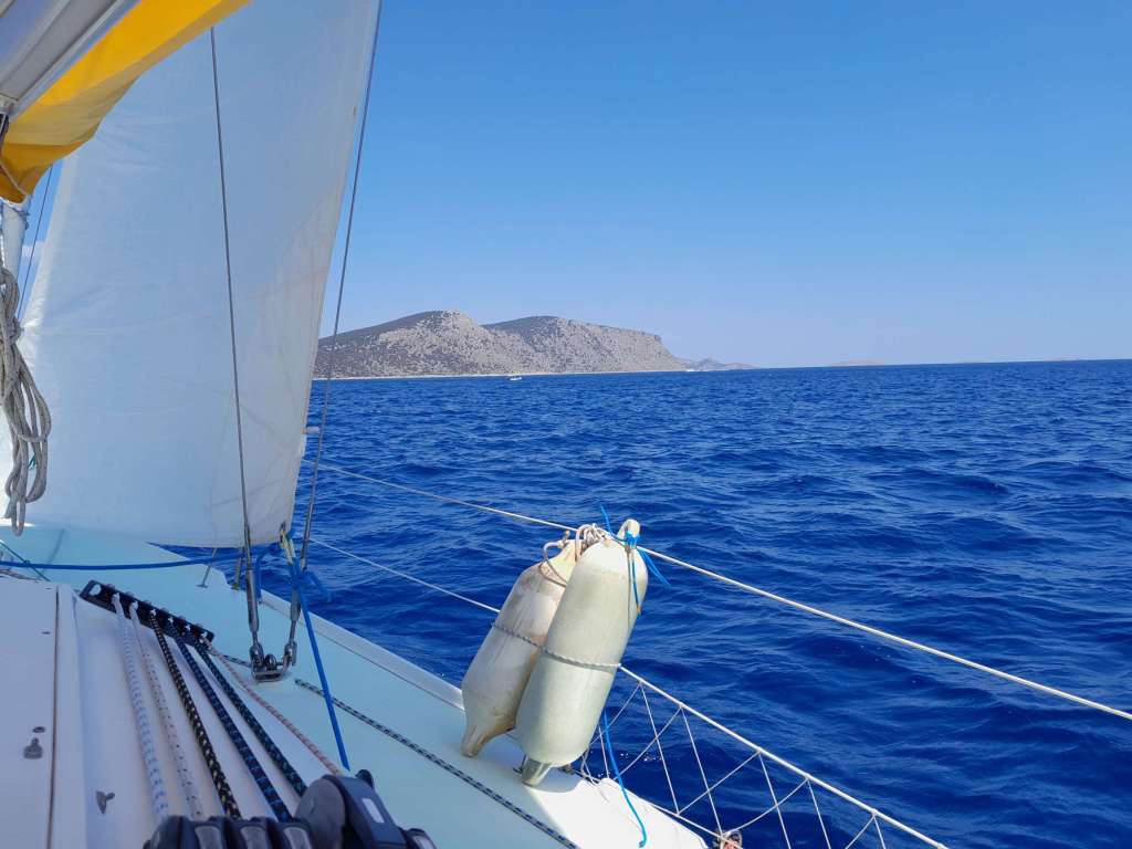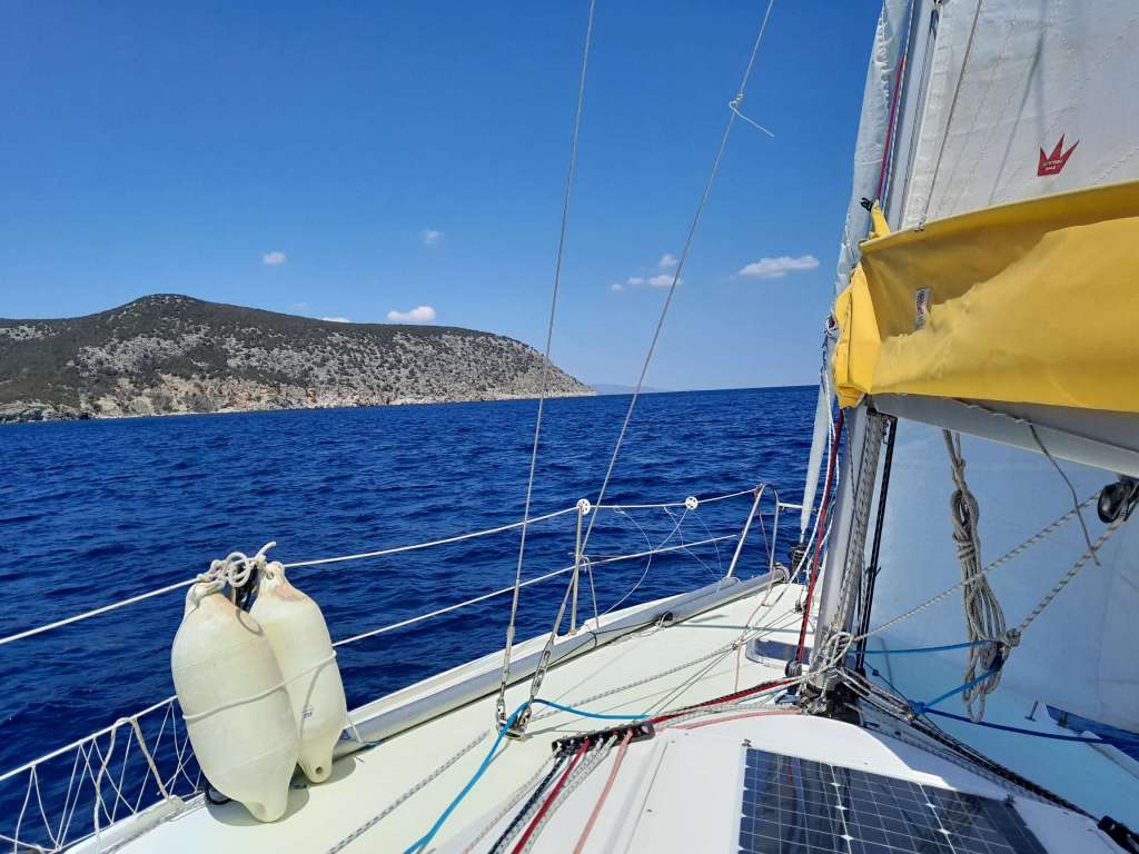 Je dois maintenant commencer à réfléchir à la suite et à l’accueil de ma Doriane qui doit me rejoindre dans quelques jours. La situation est inédite car, dans son état (vous l’aurez compris, elle est enceinte !), il n’est pas question de courir les Cyclades sous Meltem en mode supersonique, j’ai étudié un plan plus soft : la récupérer sur Athènes ou Egine selon la météo, et faire des petites navigations protégées quitte parfois à s’arrêter dans un port et louer un appartement quelques jours. Au lieu de grenouiller ici et me retrouver piégé par la météo en m’empêchant de retourner vers le nord en direction du golfe Saronique, je décide de partir direct et rallier l’île de Poros. Le vent va être compliqué à gérer car le Meltem balaye les Cyclades et son influence se fait sentir sur le continent, pile sur mon trajet.