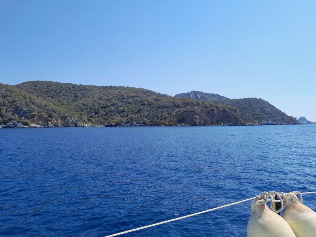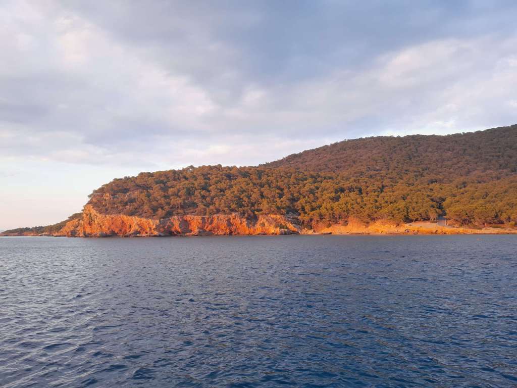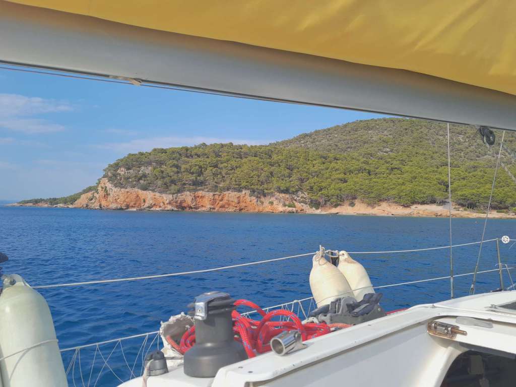 Je découvre au petit matin l’endroit qui a été mon écrin pour la nuit. L’île est très différente des autres découvertes à ce jour, très verdoyante mais surtout parcourue d’une grande forêt de pins maritimes. C’est assez rare de retrouver cette essence dans ce coin de la Grèce car souvent il s’agit de cyprès et d’oliviers. Et, petit plaisir du matin, je sens les fragrances caractéristiques du pin en Méditerranée. Mais il est temps de lever l’ancre pour rejoindre les parages d’Egine. Le vent est toujours là, il souffle aujourd’hui du nord-nord-ouest ce qui signifie que je vais devoir à nouveau tirer des bords !