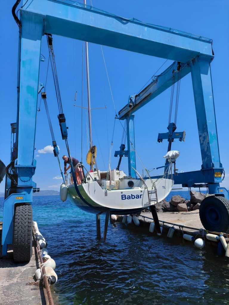 C’est dans ce morceau de paradis que, dans la soirée, je reçois un appel de Doriane m’indiquant qu’elle souffre du Covid. Enfer et damnation ! je suis ici dans ma crique, à des milliers de kilomètres pendant qu’elle souffre toute seule sur Paris. Je laisse passer la nuit et, au petit matin, mardi 12 juillet, je me lève à cinq heures du matin avec la ferme décision de remettre le bateau au sec et rentrer en France. Je mets le cap sur le chantier d’Egine avec bon vent. Pendant ce temps, je change mon billet d’avion pour le soir, je réserve un billet de ferry pour le Pirée et j’envoie un message au chantier pour les prévenir de mon arrivée. Je suis sur zone peu avant midi. Le temps de nettoyer et ranger Babar, je prends le ferry à 16h et l’avion à 19h30. Je suis le soir même sur Paris pour m’occuper de ma Dodo ! record battu mais la croisière est terminée pour cette année. C’était court mais intense.