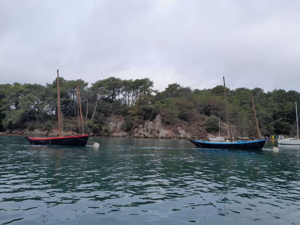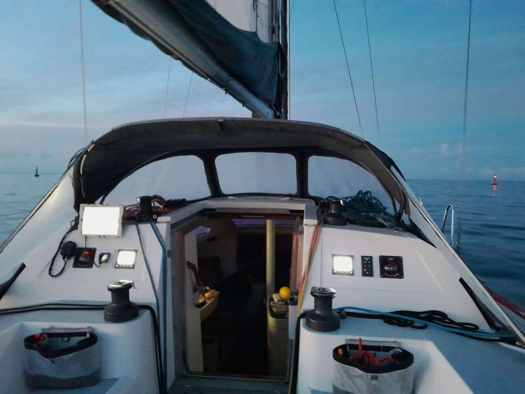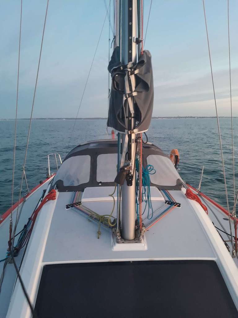 Je suis accueilli directement à la gare de Lorient à 21h par Mathieu, president de la dynamique association des propriétaires de RM https://rm-asso.org/. J’embarque pour le week-end à bord du magnifique voilier de ce très sympathique couple avec Stephanie son épouse. Nous arrivons de nuit au port de Kernével dans la rade de Lorient. C’est marée basse et c’est par une passerelle fortement inclinée que nous arrivons au bateau. L’air de la mer est imprégné de puissantes odeurs marines et l’évocation de l’océan est déjà là, présent dans l’air avec un mélange d’humidité et de ces odeurs caractéristiques qui émanent des voiliers. Car le nombre de voiliers est immense et inversément proportionnel au nombres de bateaux moteurs en Méditerranée ! Je suis sur excité ! Après quelques discussions et visite de ce fameux bateau que j’ai tant étudié virtuellement, il est temps d’aller se coucher. Ma cabine est prête, à l’avant. Je regarde par le hublot la pleine lune briller à travers quelques filets de hauts nuages et j’imagine l’océan à quelques encablures par delà la rade de Lorient. Je ne trouve que difficilement le sommeil, comme un gamin la veille de Noël.