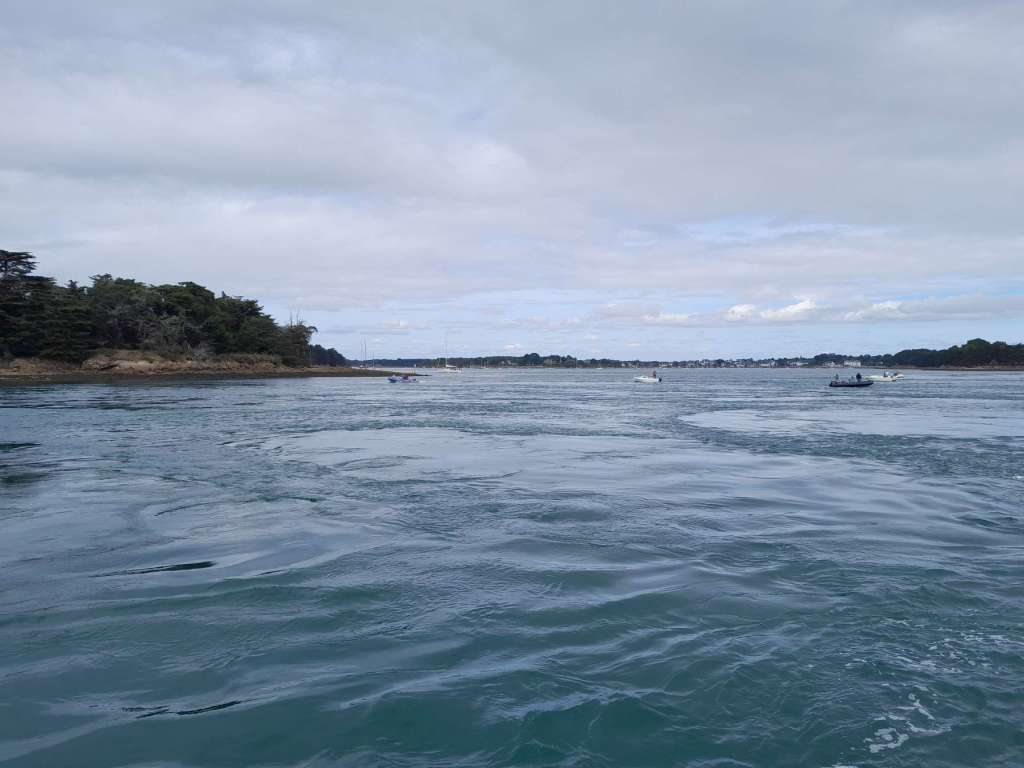 Nous nous présentons enfin devant l’entrée du golfe du Morbihan, pile à l’heure de la bascule de marée au moment du flot, par courant favorable. Nous laissons à babord, l’îlot de Meaban et la cardinale Est de Bagen Hir puis à tribord le petit port de Navalo. Ça y est nous sommes dans la marmite bouillonnante ! Nous sommes à plus de dix nœuds, sur un véritable tapis roulant qui porte tous les bateaux de façon assez coquasse, tout le monde avançant en crabe à forte vitesse. Il est encore tôt pour se présenter devant le port de Vannes dans de bonnes conditions. Nous décidons tous de mouiller devant une plage de l’île d’Artz. Ah le bonheur d’un guindeau électrique !