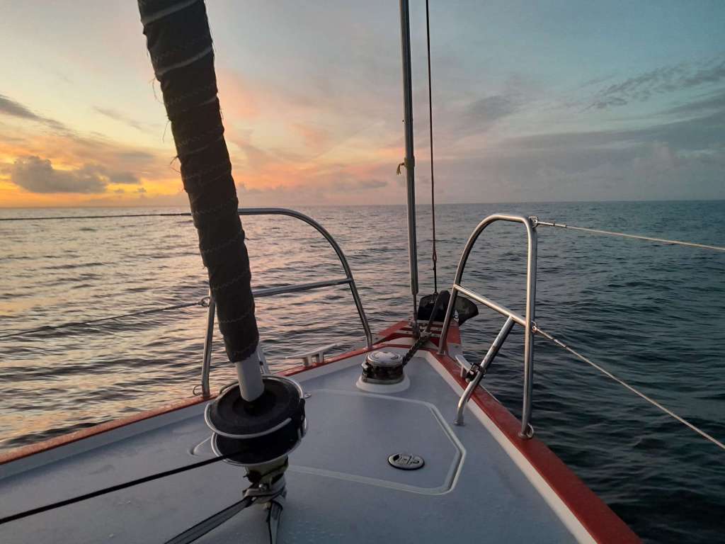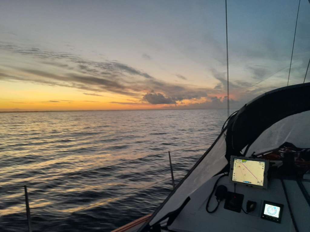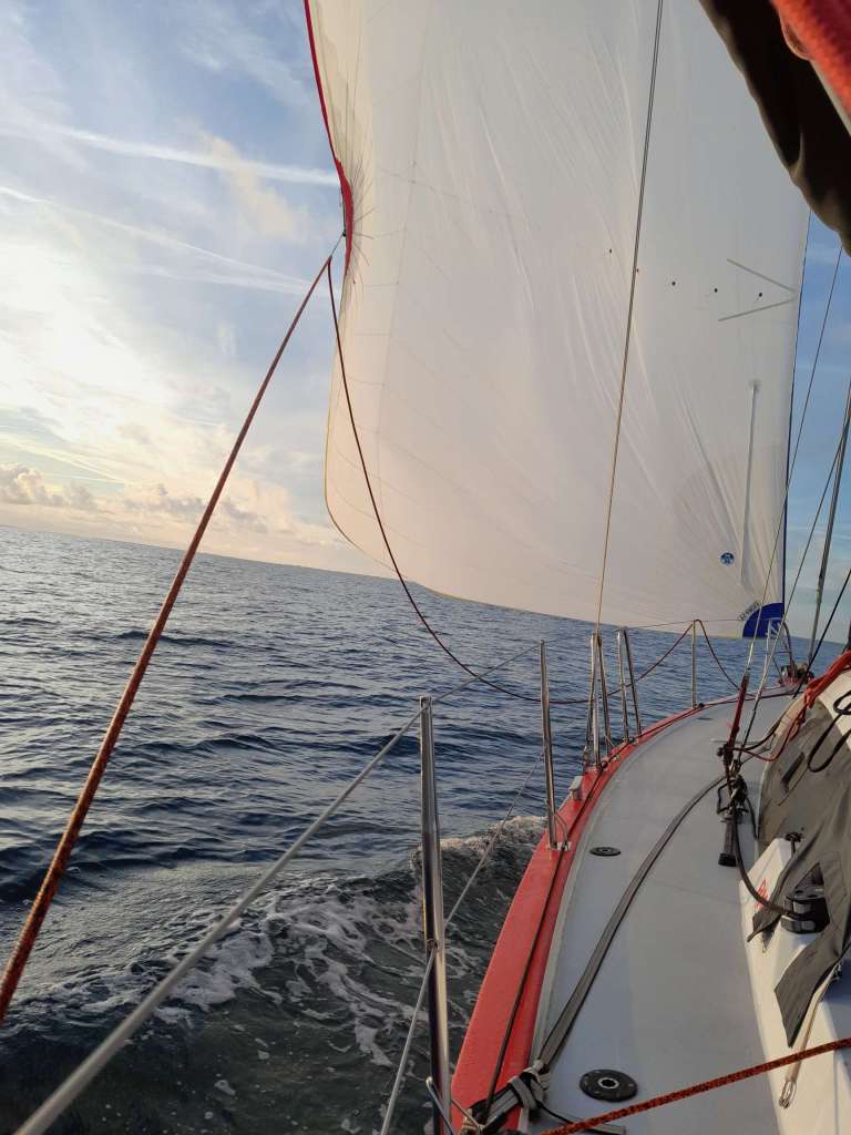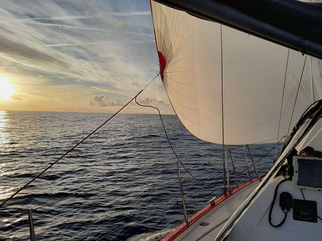 Ça y est nous voici en mer. L’océan s’ouvre devant moi. Le vent est faible mais nous envoyons le grand spi pour faire route à la voile. La houle est là, la fameuse respiration de l’océan qui rend la navigation si pénible pour les estomacs. Il y a entre un et deux mètres pour une ondulation de 10 secondes environ. L’aube naissante laisse apparaître au sud ouest les côtes de l’île de Groix. « Qui voit Groix, voit sa croix » dit le dicton marin. Aujourd’hui, point de croix à l’horizon, mais de gros nuages sur la haute mer, derniers stigmates de la grosse tempête qui a sévit depuis plusieurs jours sur l’atlantique nord.