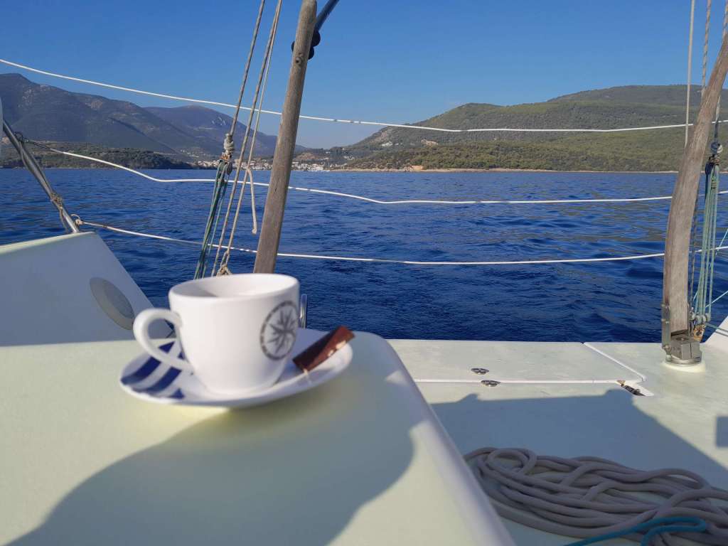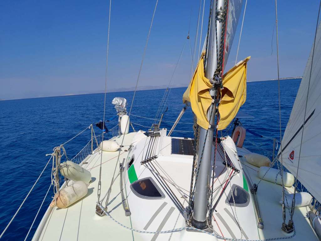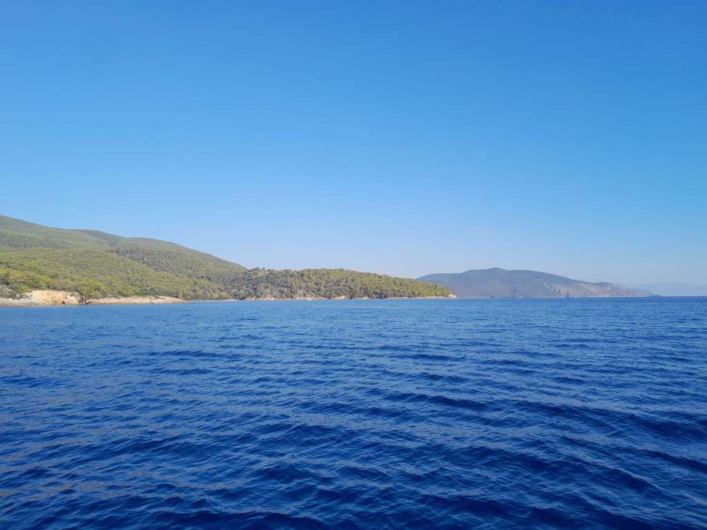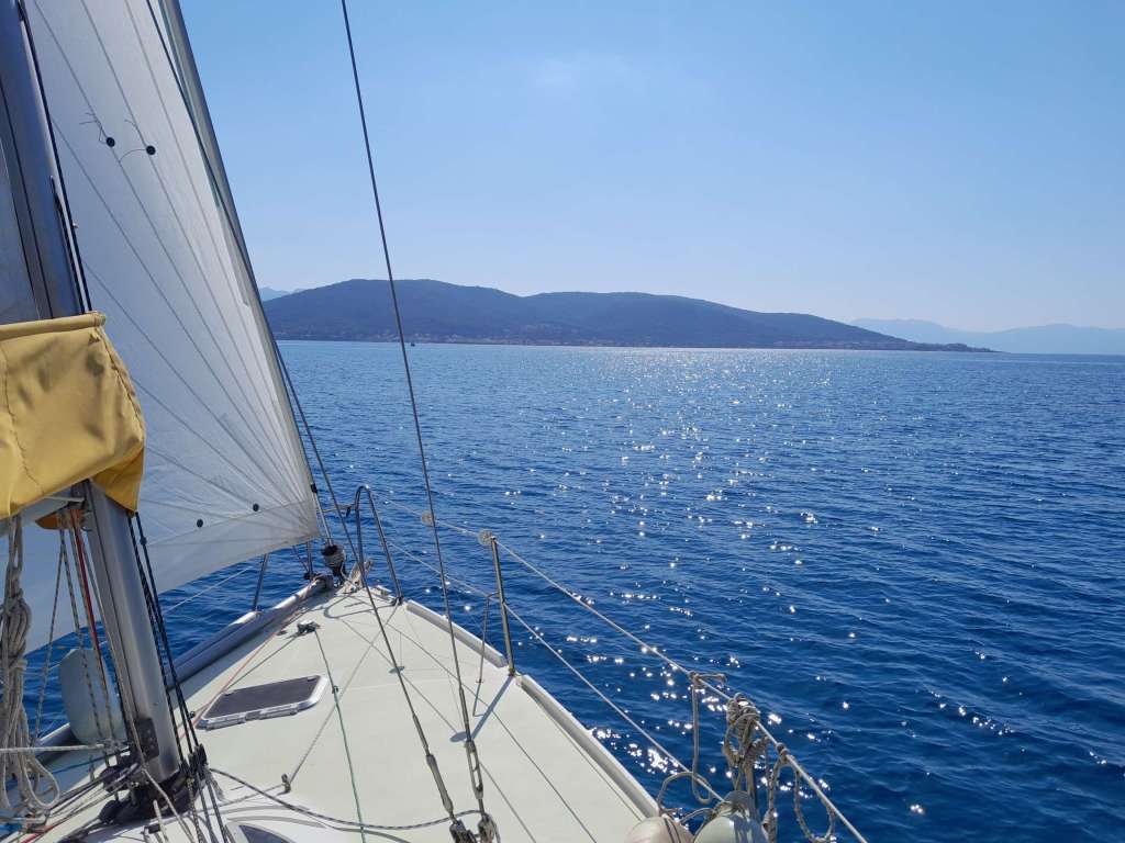 Cap sur le golfe de Poros situé au sud. Très vite j’établis les voiles et éteins le moteur. Je ne me lasse pas de cette belle sensation d’une glisse parfaite sur mer plate à près de cinq nœuds au près serré. Je me sens en totale harmonie avec les éléments.