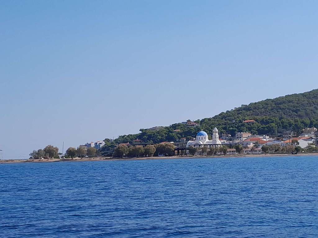 Mais avant d’en arriver là, je me régale de cette belle navigation à tenir mes distances avec les autres voilier et en les dépassant aussi. Dans les parages de Poros, le vent tourne plus Est et forcit un peu en embouquant le canal nord de sa petite mer intérieure. Je déboule à sept nœuds dans cet endroit insolite. Je prends sur ma droite, enroule le génois qui désormais ne porte plus, me retrouvant vent arrière. En vue du mouillage, j’affale la grand voile, prépare l’ancre, tourne un peu sur le plan d’eau à sonder, puis je mouille l’ancre. L’endroit est très apaisant avec des arbres courts et de la végétation verte sur les rives. Après un bain et avoir vérifié l’ancre, la soirée se déroule sous un ciel nuageux.