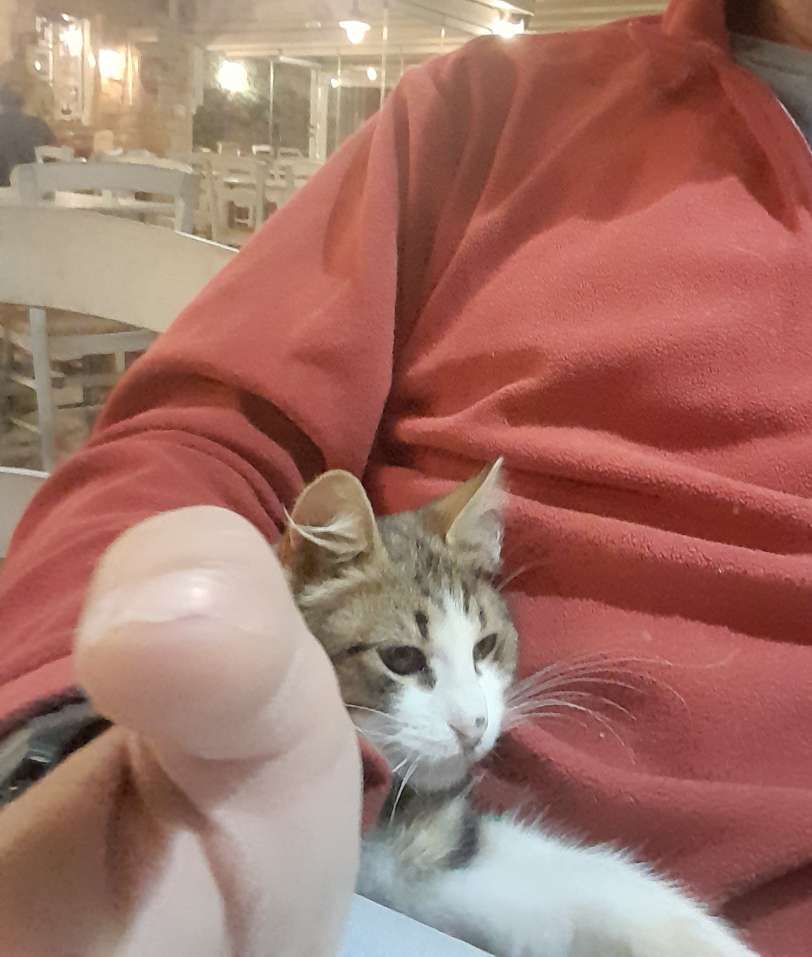 Je longe maintenant l’île d’Egine dans le but de revenir à Agistri car, un vent de nord ouest est censé se lever dans la nuit m’interdisant un mouillage que j’avais prévu au sud de l’île. Certes le vent n’était pas prévu fort mais il suffit d’avoir un force trois pour rendre la nuit rouleuse dans une baie ouverte à cette direction. J’ai donc décidé de revenir à ce port paisible que j’apprécie tant. Mais pour y arriver je dois, là encore, tirer des bords dans un vent affaibli. La soirée au port va commencer au bistrot et se finir à la taverne entouré de chatons affamés que je nourris de mes restes de porc. Un d’entre eux, pas farouche s’entête à vouloir monter sur mes genoux. Je répense à mon Solenzu.
